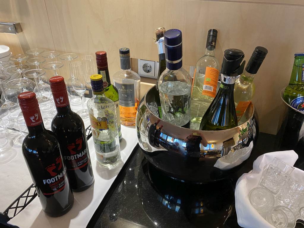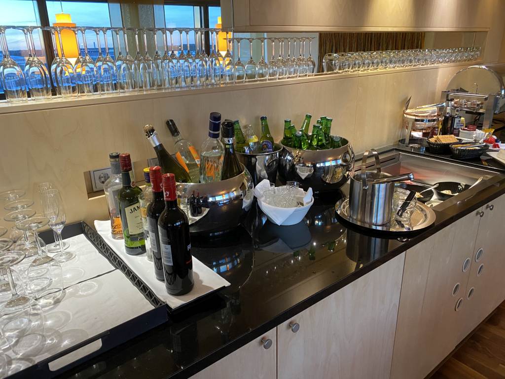 Zur Auswahl alkoholischer Getränke, gesellte sich neben Bier (Heineken) und Wein (weiß, rot und sparkling) auch eine kleine Auswahl an Spirituosen. Dazu gehörte unter anderem ein Whisky, Cognac und Gin. Der Wodka wurde in zivilisierter Art und Weise auf Eis bereitgestellt.
