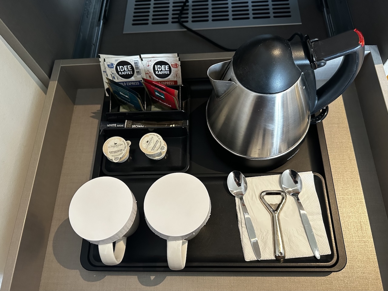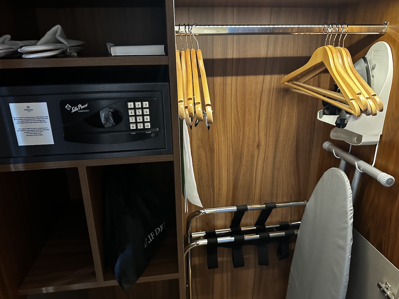 Zur weiteren Ausstattung gehören u.a. auch Bügeleisen, Safe, Kofferablage und Wasserkocher. Für die Wasserflaschen will man 4 Euro haben, es sein denn man ist bei Honors angemeldet.