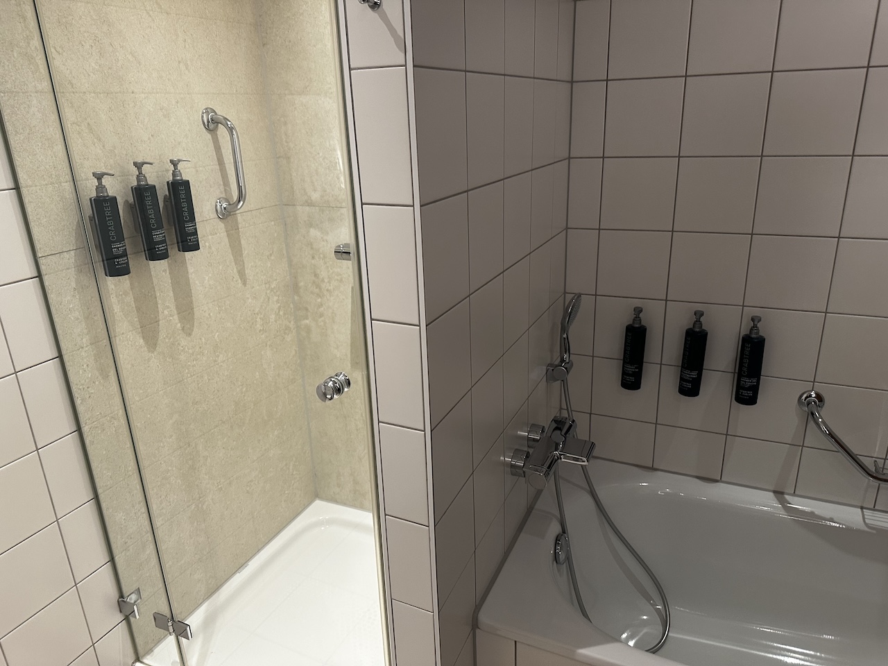 Hier noch ein Blick ins Bad, darin eine abgetrennte Dusche und die üblichen Pflegeprodukte. An den Fließen kann man sehr deutlich erkennen, dass das Hotel bei der letzten Auffrischung nicht komplett renoviert wurde.