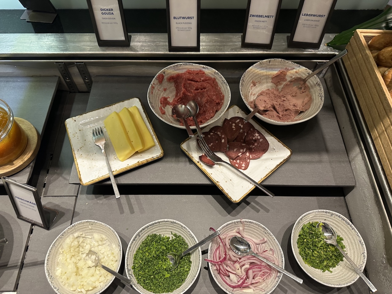 Das Angebot entspricht dem üblichen Sortiment in großen Hotels. Am Buffet findet Ihr die üblichen Bestandteile für ein reichhaltiges Frühstück. Im Sortiment waren auch Blutwurst und Mett.