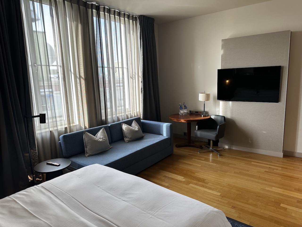 Neben dem großen Bett waren auch ein größeres Sofa sowie ein Tisch im Zimmer. Die Freifläche in der Mitte des Zimmers wirkt etwas verschenkt.