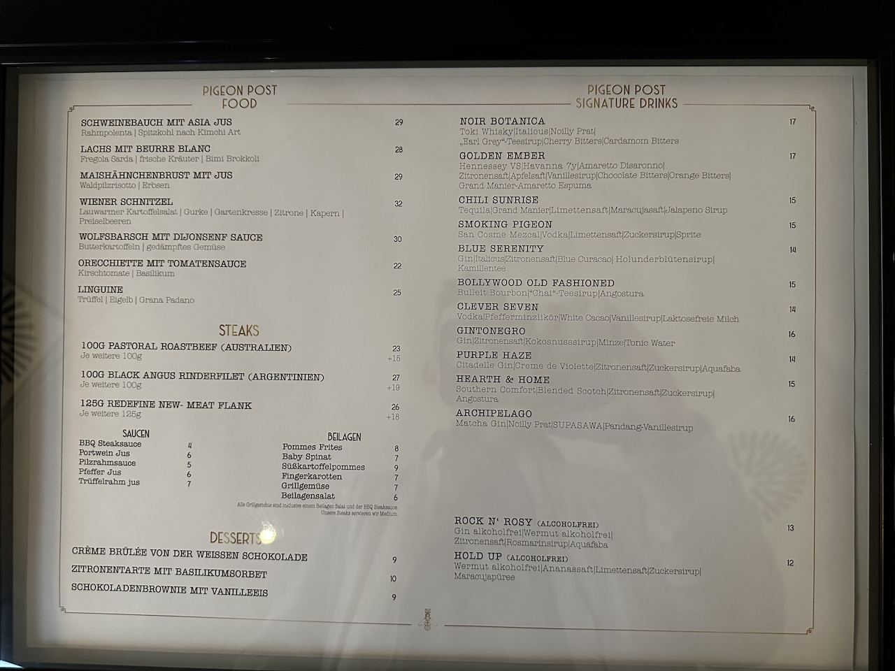 Auf der Karte stehen Snacks und vollwertige Mahlzeiten sowie Getränke inklusive Cocktails. Die Preise sind stellenweise ganz schön gesalzen.