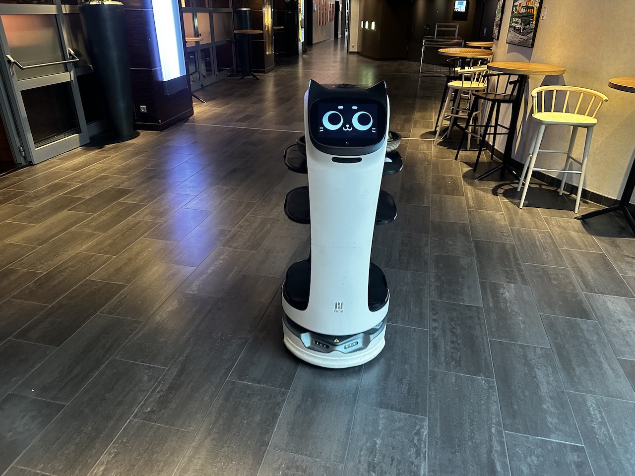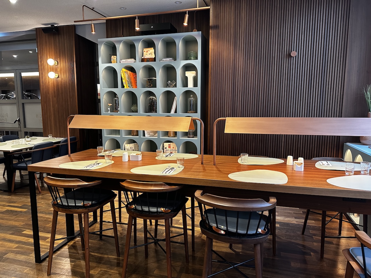Der Restaurantbereich besteht hauptsächlich aus Tischen mit Stühlen, in einer Ecke sind auch Tresen mit Hochstühlen.