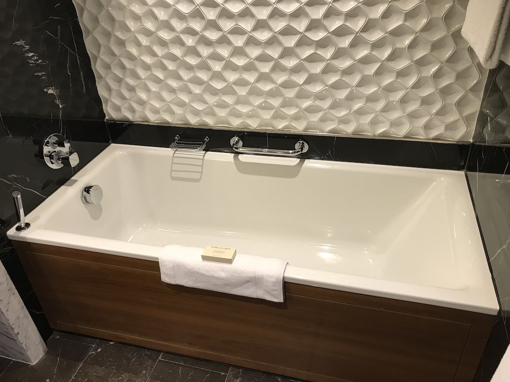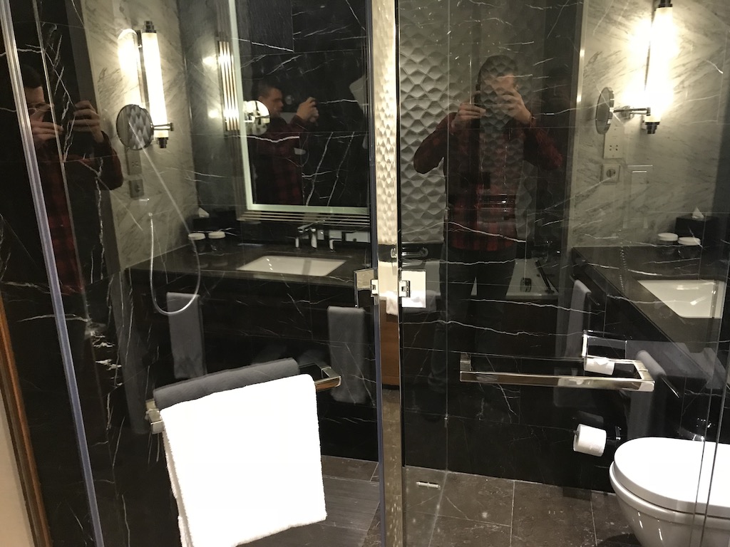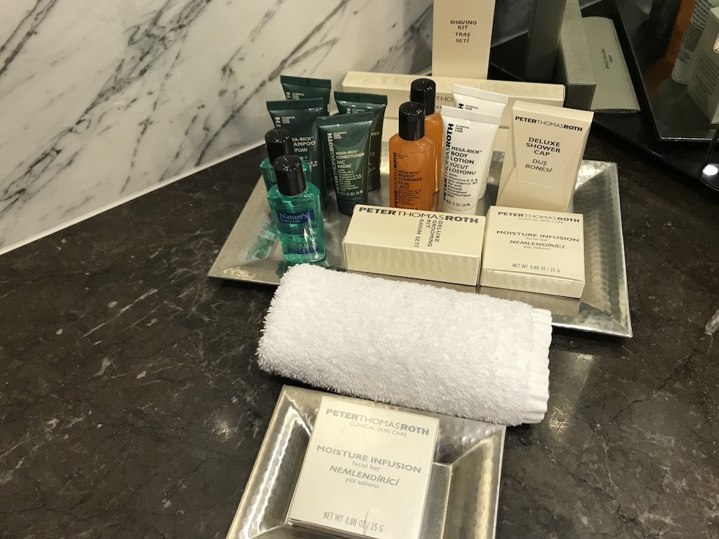 Im Badezimmer gab es, wie bei Hilton üblich, eine Auswahl von Pflegeprodukten der Marke Peter Thomas Roth. Weiterhin verfügte dieses über eine große Badewanne und eine Dusche mit Massage- und Regenfunktionen.