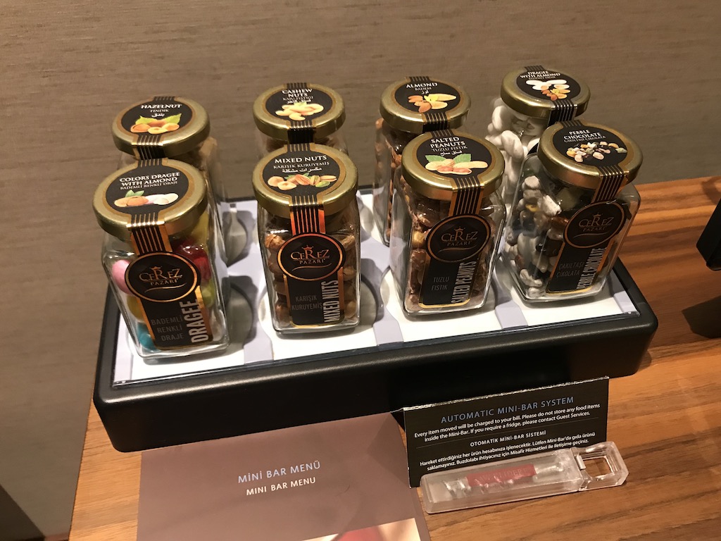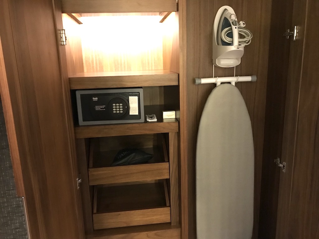 Ferner gab es natürlich im Schrank auch ein Bügeleisen sowie einen Safe. Neben der Minibar stand ein kleiner Desserttisch mit mehreren Arten von gerösteten Nüssen bereit. Die kostenfreie Minibarnutzung ist für Statuskunden bzw. Gäste des Executive Floors hier allerdings nicht inkludiert.