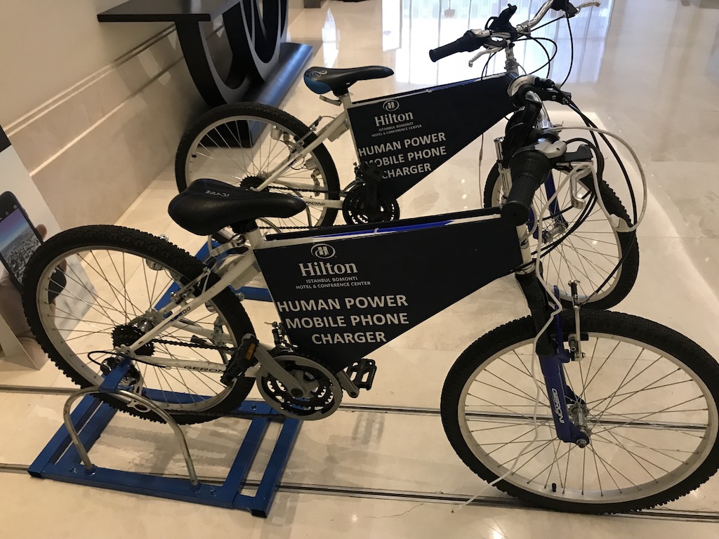 Weiterhin finden sich im großen Lobbybereich, rund um die Rezeption angelegt, auch zahlreiche Sitzmöglichkeiten, die zum Verweilen einladen. Auch zwei Fahrräder, mit denen man sich selbst den Strom zum Laden des eigenen Smartphones „erarbeiten“ kann, gibt es hier.