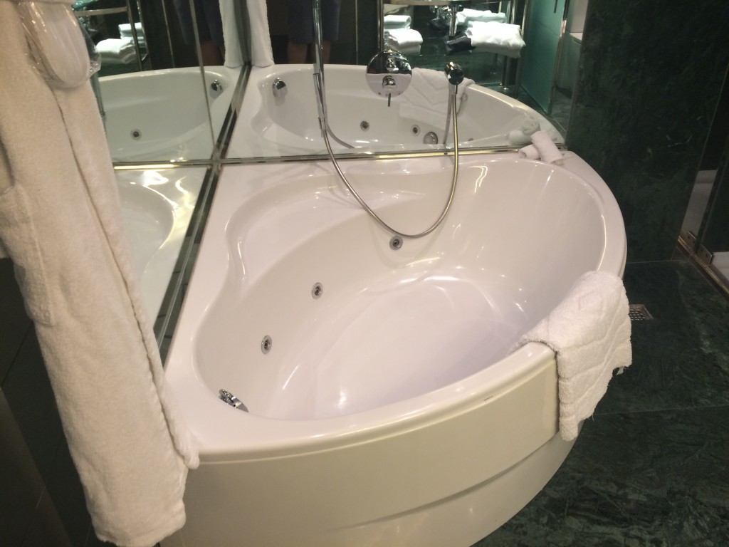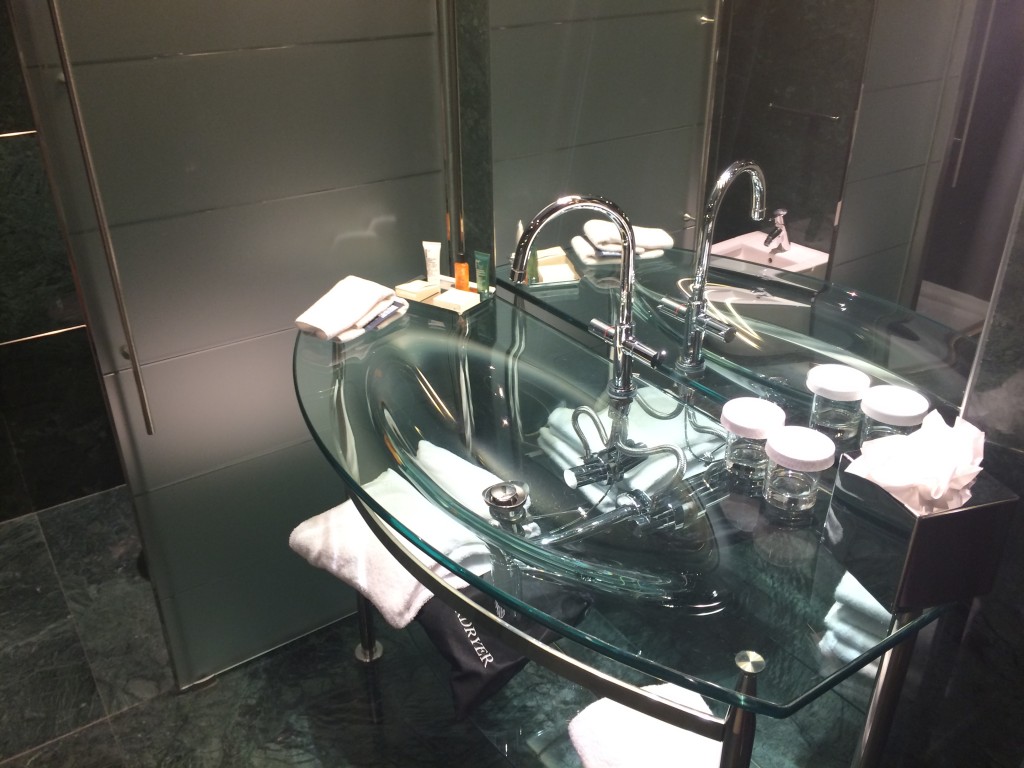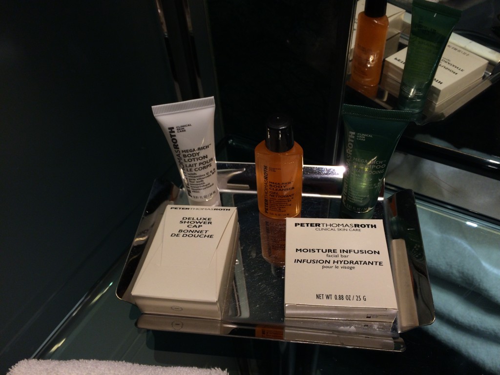 Das Highlight des Zimmers war das Bad. Es war zum Zimmer hin offen gehalten, wobei es mit Glasschiebetüren verschließbar war. In dem modernen Bad gab es neben einer Walk-in Dusche und einer separaten Toilette mit Bidet auch eine große Eckbadewanne mit Whirlpoolfunktion. Die Badezimmer Amenitys von Peter Thomas Roth sind Standart. Leider gab es keine Extras wie Bürste, Zahnbürste oder Conditioner.