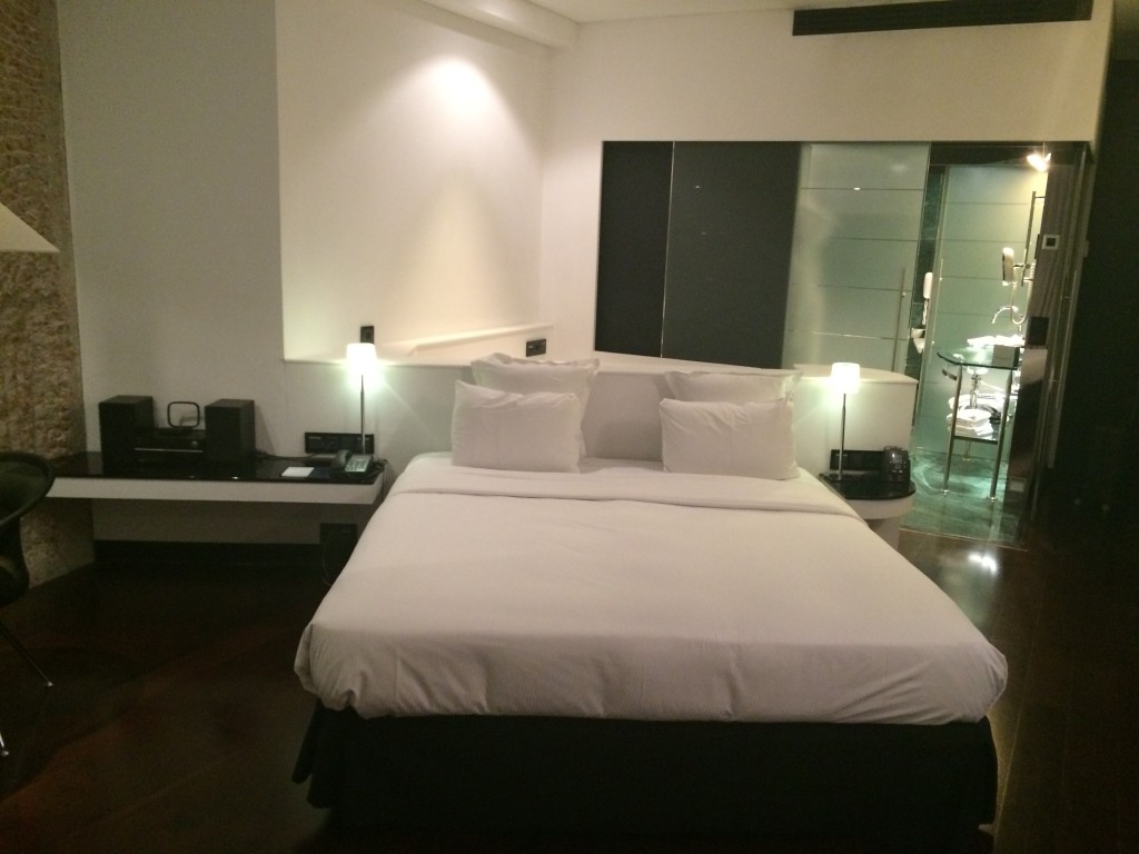 Bei den King Relaxation Room handelte es sich um ein Eckzimmer mit rund 45qm. Es war, typisch für Hilton, modern eingerichtet. Gut hat mir vor allem der Schreibtisch direkt hinter dem Bett gefallen. Dadurch, dass das Bett mitten im Zimmer stand, wirkte das Zimmer aber nicht wirklich größer als ein Standardzimmer, aber man kann es mit Sicherheit auch nicht als beengt beschreiben. Bei der Größe des Zimmers war das allerdings kein Problem. Im Hintergrund kann man das offene Bad sehen.
