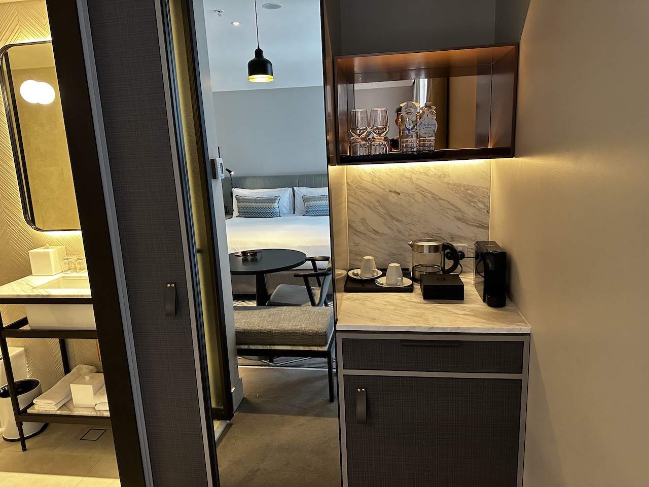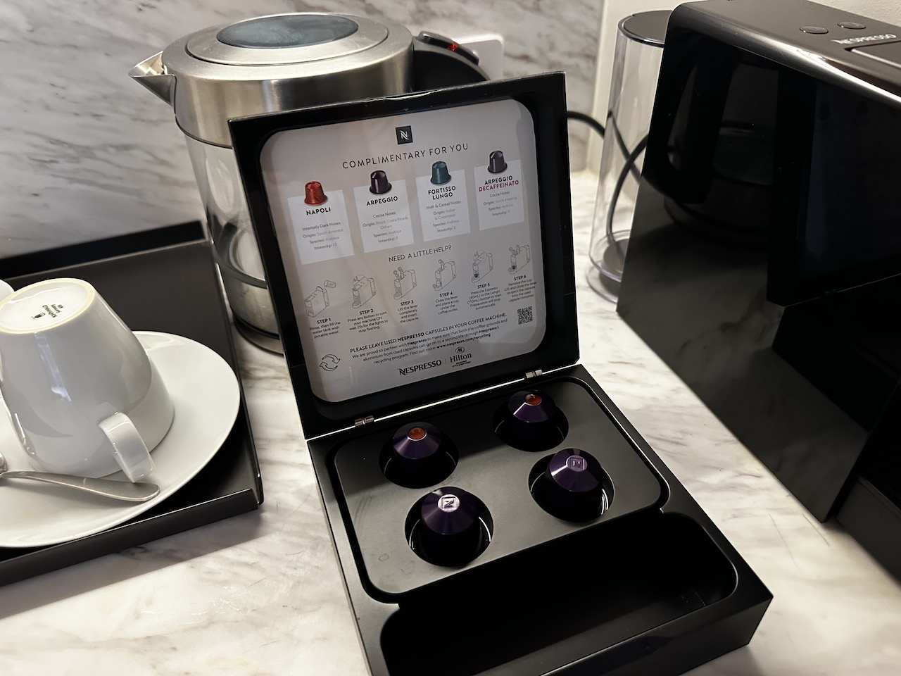 Durch eine Vielzahl von Lampen, Spots und indirekter Beleuchtung kann man eine gute Atmosphäre schaffen. Es stehen zahlreiche Stromanschlüsse zur Verfügung. Im Zimmer war u.a. auch eine Nespresso-Kapselmaschine und natürlich auch Wasserkocher, Kühlschrank, usw.