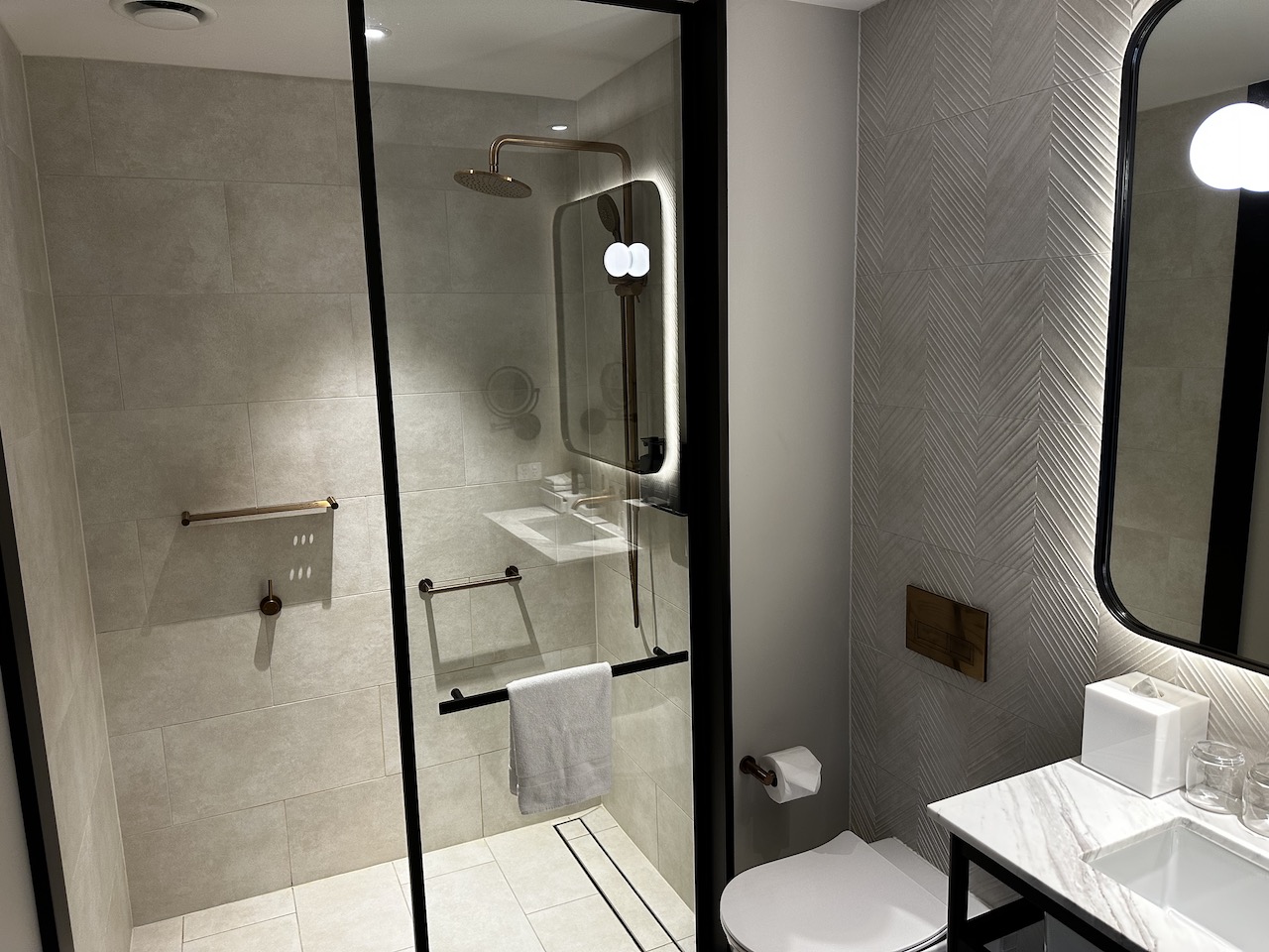 Der Platz reicht nicht so ganz für große Koffer, Ablagen und Kofferständer sind wie so oft für kleinere Exemplare gedacht. Die Möbel und das Dekor sind hochwertig und ziemlich neu. Auch das Bad ist modern gestaltet, aber etwas klein geraten.