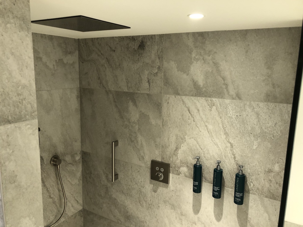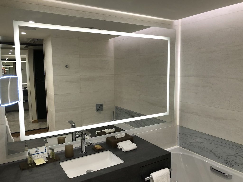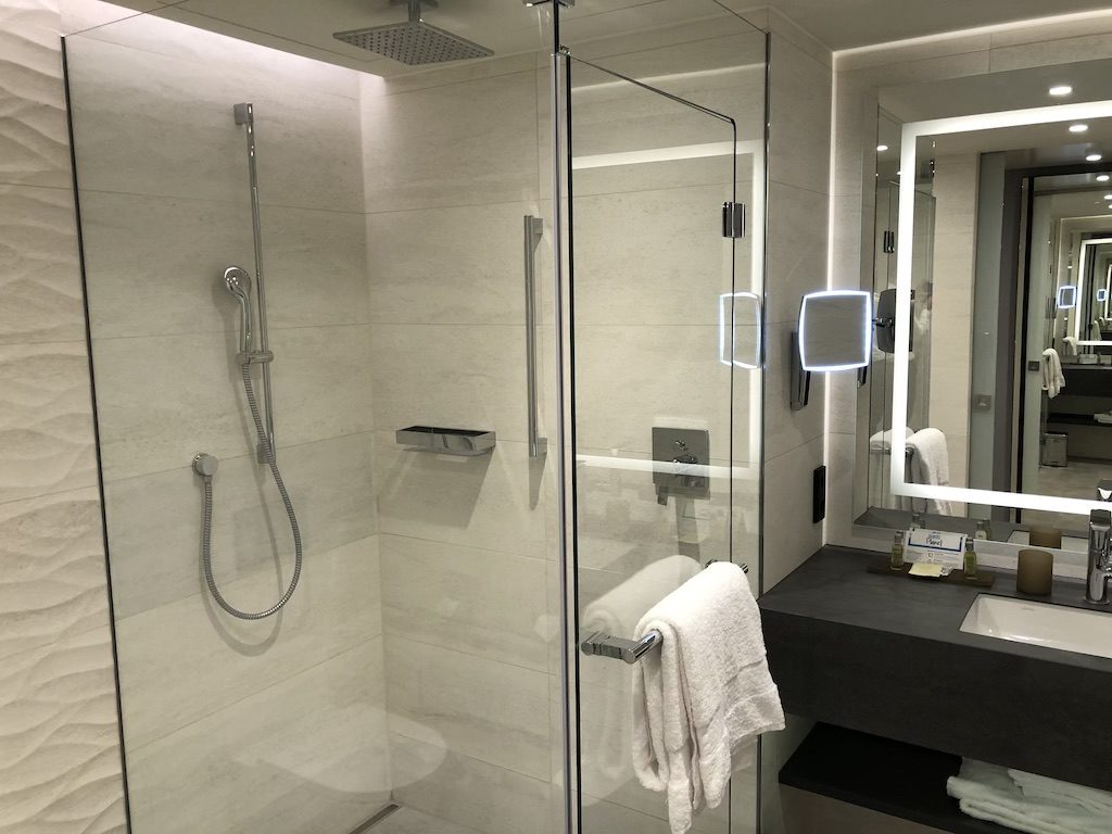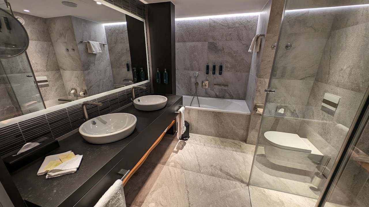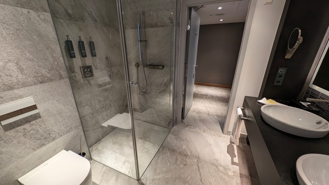 Das Bad in den normalen Zimmern ist nicht gerade groß, aber ausreichend. Es gibt auch dort genügend Ablageflächen für zwei Personen, die Dusche ist geräumig, die Wände und der Spiegel sind auch im Bad indirekt ausgeleuchtet.