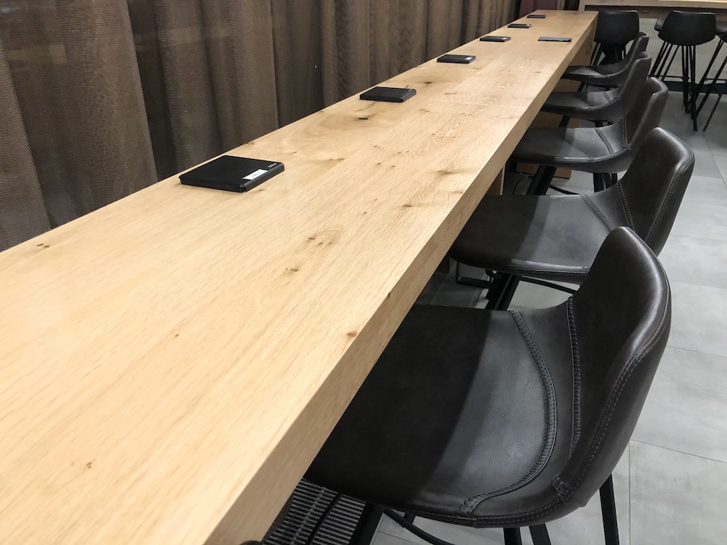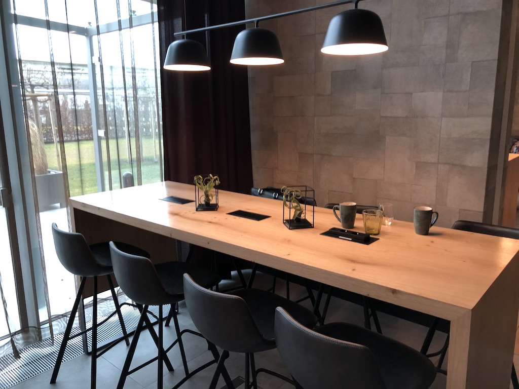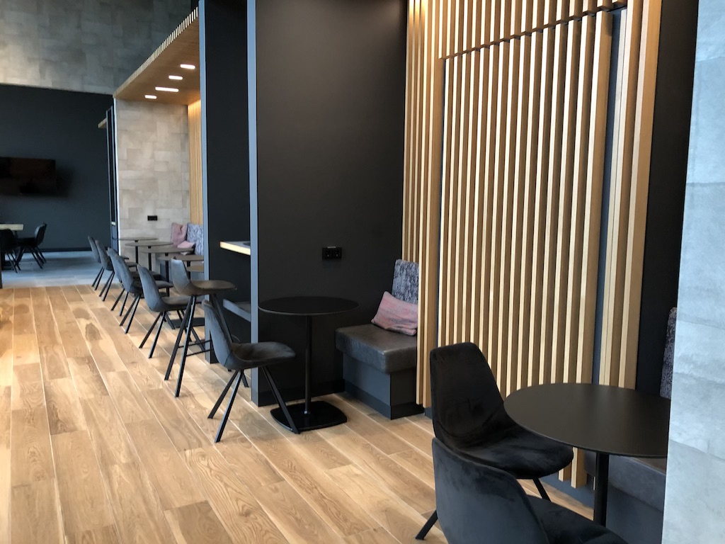 Zahlreiche Sitzmöglichkeiten wie Tresen und Barhocker, Tische mit Stühlen und bequeme Sesseln stehen zur Auswahl. Die Lounge hat riesige Fenster und ist tagsüber dementsprechend hell.