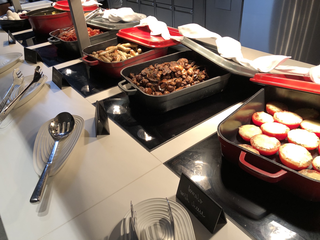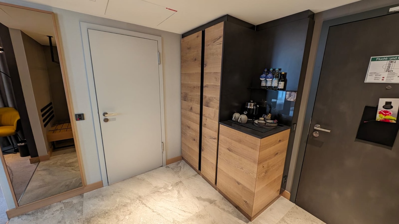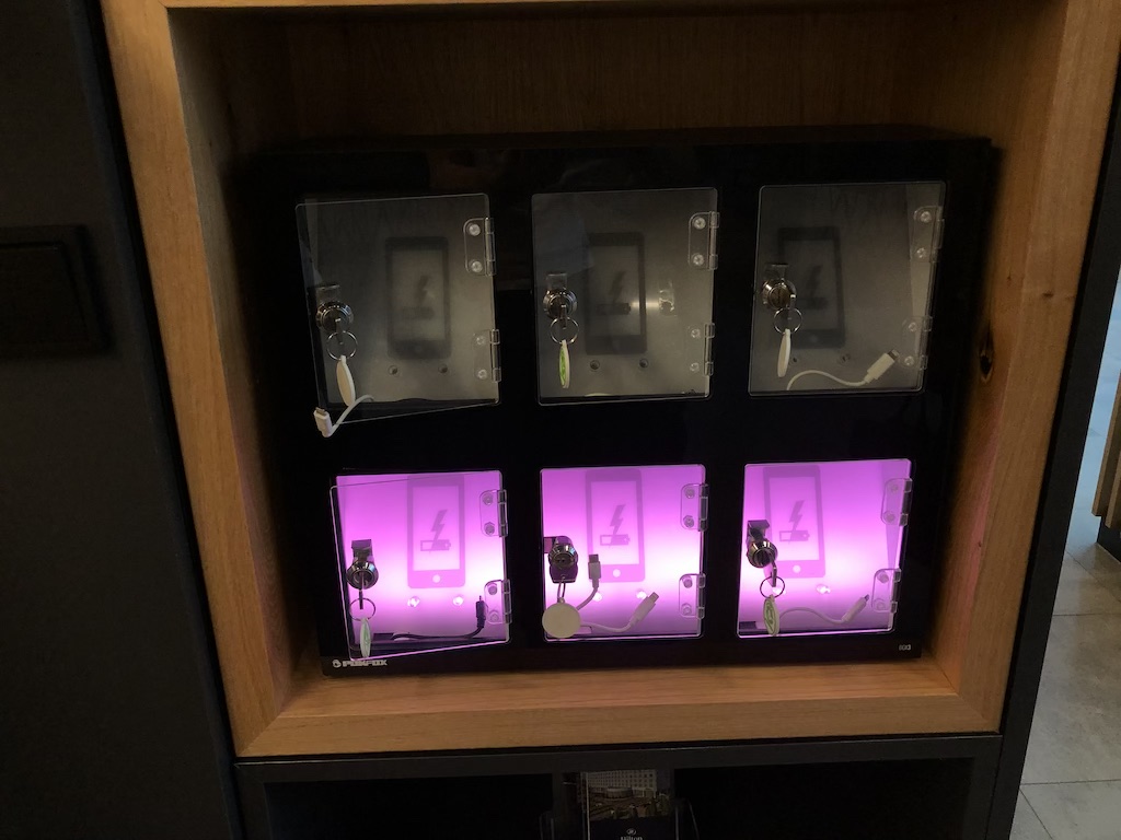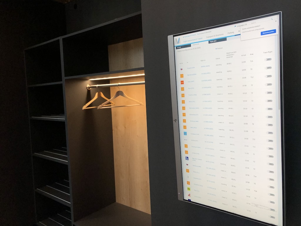 Das Design baut auf dem der Zimmer auf. Das Buffet ist direkt im Eingangsbereich, es folgen ein Monitor mit Flugauskünften, eine Garderobe und ein Schrank, in dem Telefone aufgeladen werden können.