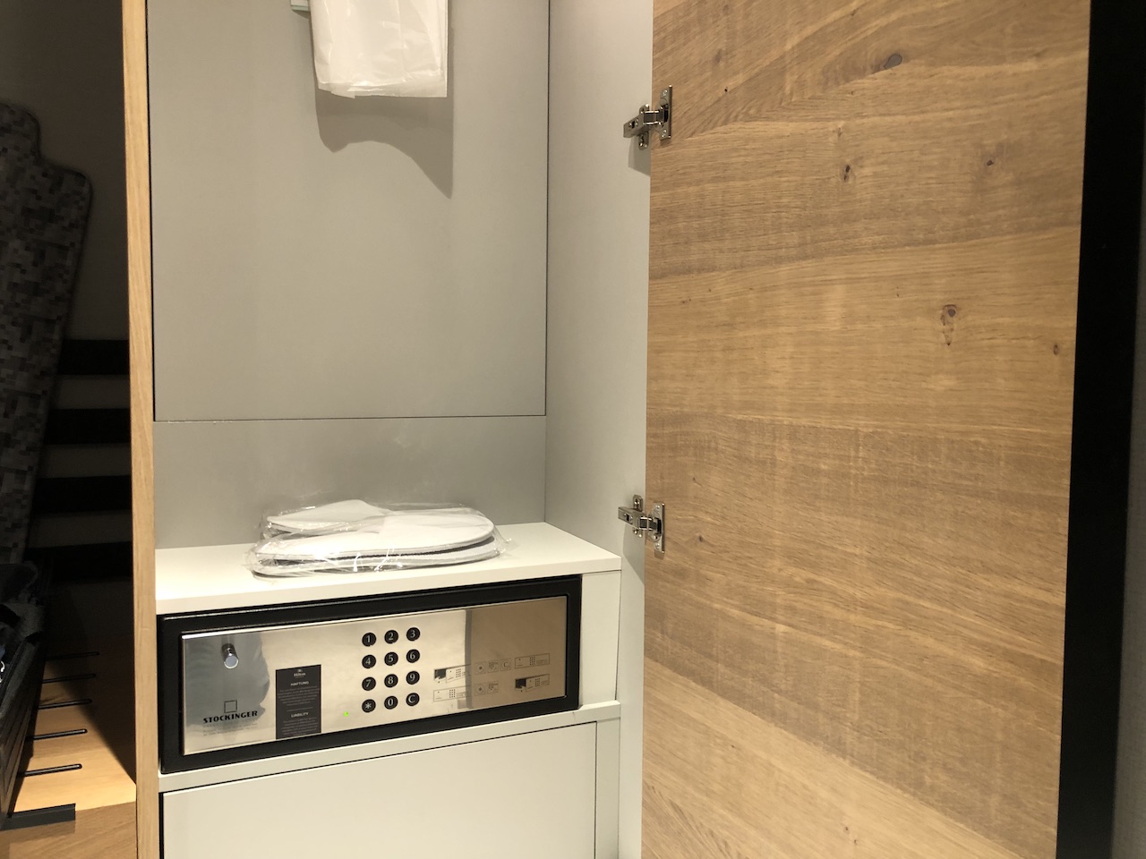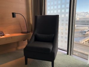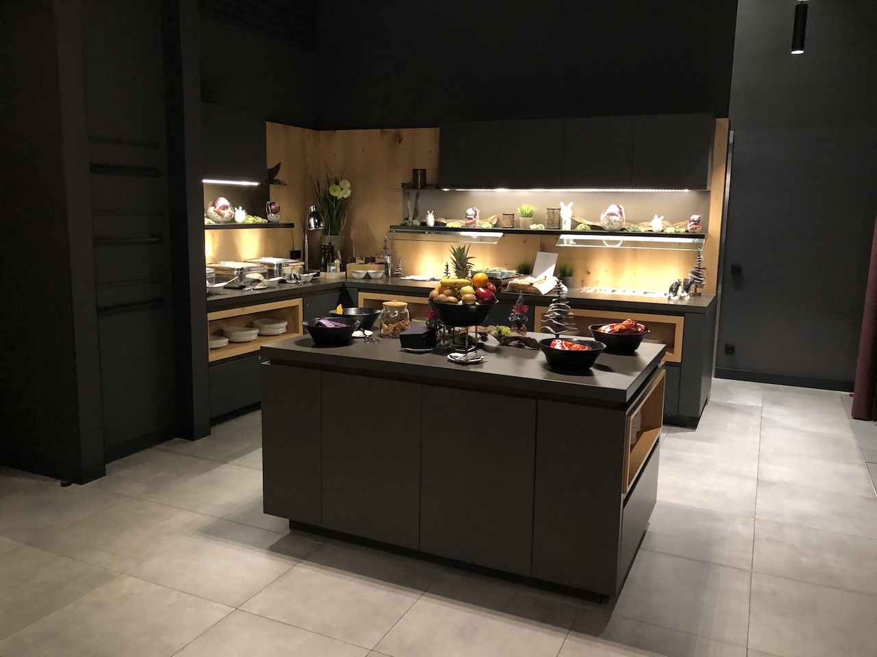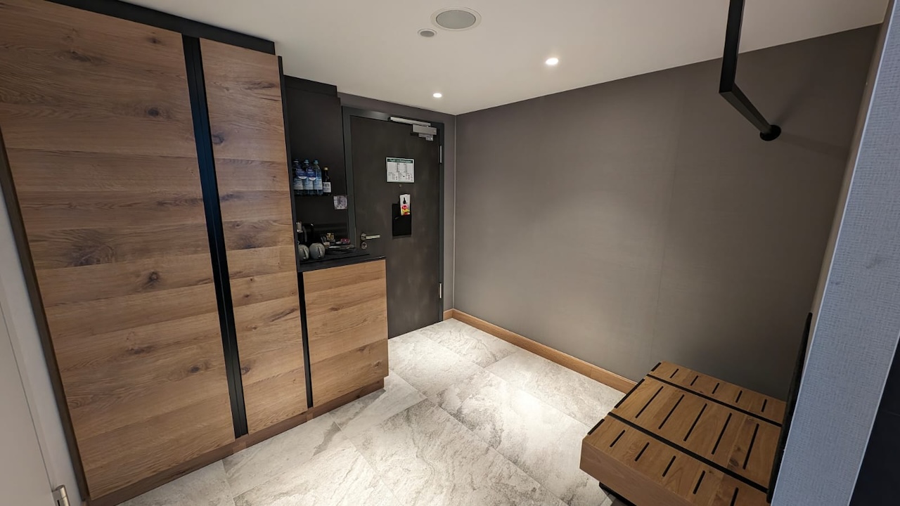 Das Design baut auf dem der Zimmer auf. Das Buffet ist direkt im Eingangsbereich, es folgen ein Monitor mit Flugauskünften, eine Garderobe und ein Schrank, in dem Telefone aufgeladen werden können.