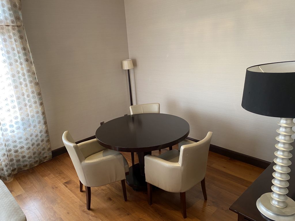 Das Design der Suite ähnelte dem unseres vorherigen Zimmers. Der Unterschied lag in der Größe und Ausstattung. Während die Bäder kaum voneinander abwichen, gab es ergänzend zum Schlafzimmer noch ein großes Wohn- und Esszimmer. Ausgestattet war der zusätzliche Raum mit einem Sofa, einem großen Esstisch mit Stühlen und zusätzlichen Sideboards und einem zweiten Fernseher.