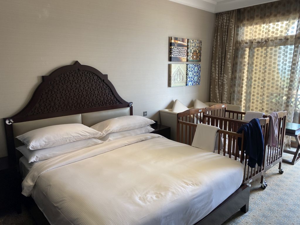 Doch auf unserem Zimmer wartete die nächste Überraschung. Statt eines King-Betts warteten Twin-Betten im Zimmer auf uns. Hier habe ich einen Fehler gemacht. Ein Family-Room war bisher für mich immer entweder ein größeres Zimmer mit Sofa-Bett oder ein Zimmer mit einem Nebenraum mit Betten für die Kinder. Aber im Hilton Ras al Khaimah sind scheinbar die Stand Twin-Bett-Zimmer die Familienzimmer. Genau das was wir nicht brauchen. Noch weniger Platz durch zwei Betten statt mehr Platz für die Babybetten.