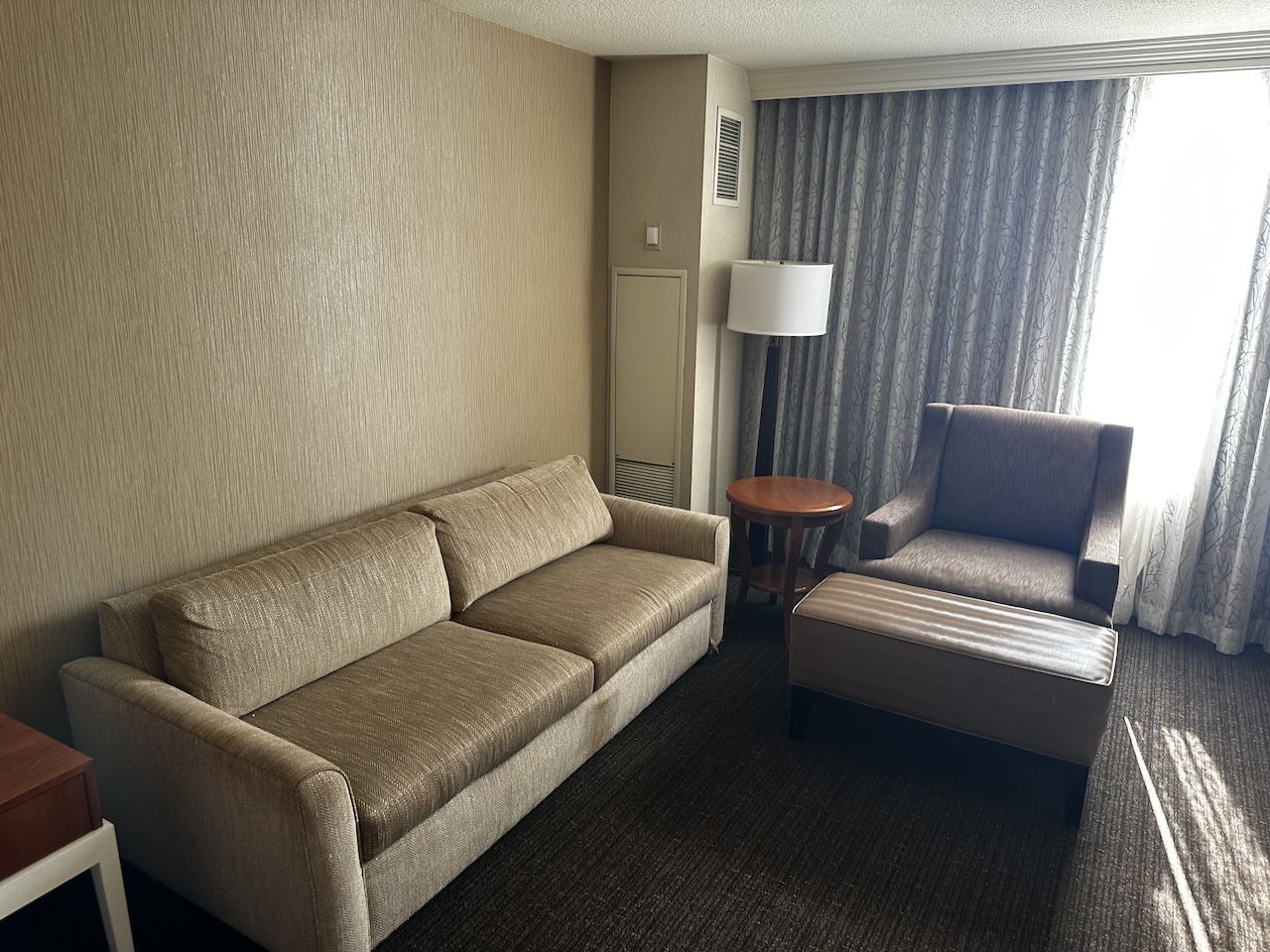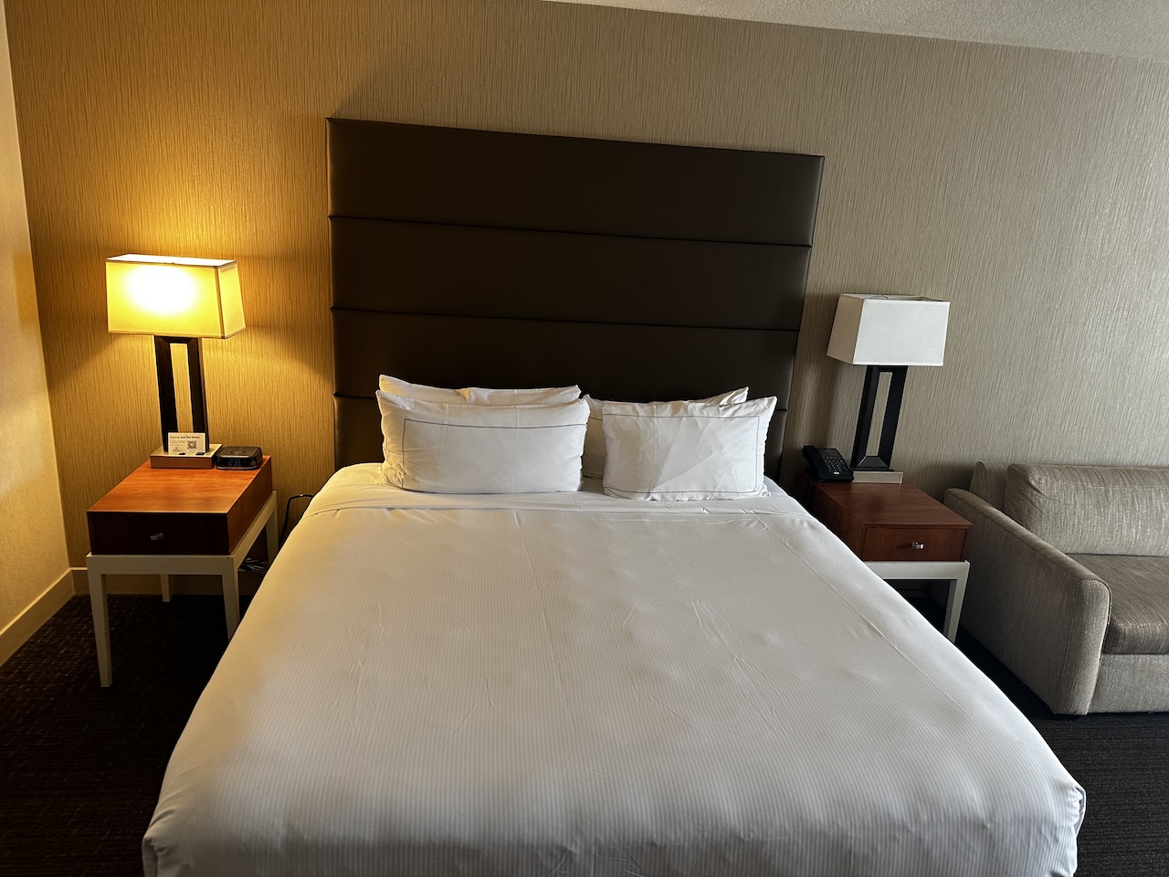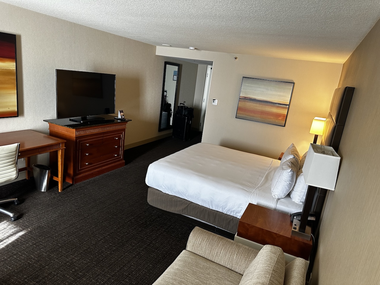 Das Hotel ist so wie man sich ein Hilton in den USA vorstellt. Viel Beton, dunklere Farben, gerne ein dicker Teppichboden und eher rustikale Möbel. Die Zimmer sind keine Ausnahme und so eingerichtet wie man es von Hilton kennt.