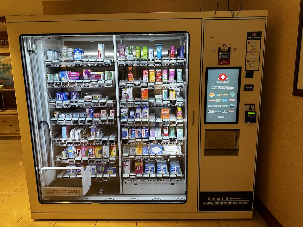 Wem das alles zu teuer ist, kann sich etwas ins Hotel liefern lassen oder zum Terminal gehen. Für Bedarfsartikel gibt es auch einen Automaten.