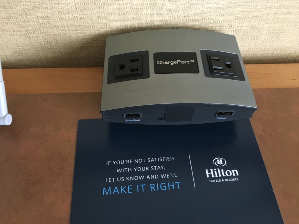 Schön bei Hilton finde ich immer die Details, wie die Station mit mehreren Steckdosen und USB Anschlüssen auf dem Schreibtisch und Nachttisch, sowie den Radiowecker mit Iphone Anschluss. Im Fall vom Hilton Seattle Airport, sogar bereits mit den neuen Anschlüssen für Modelle ab Iphone 5.