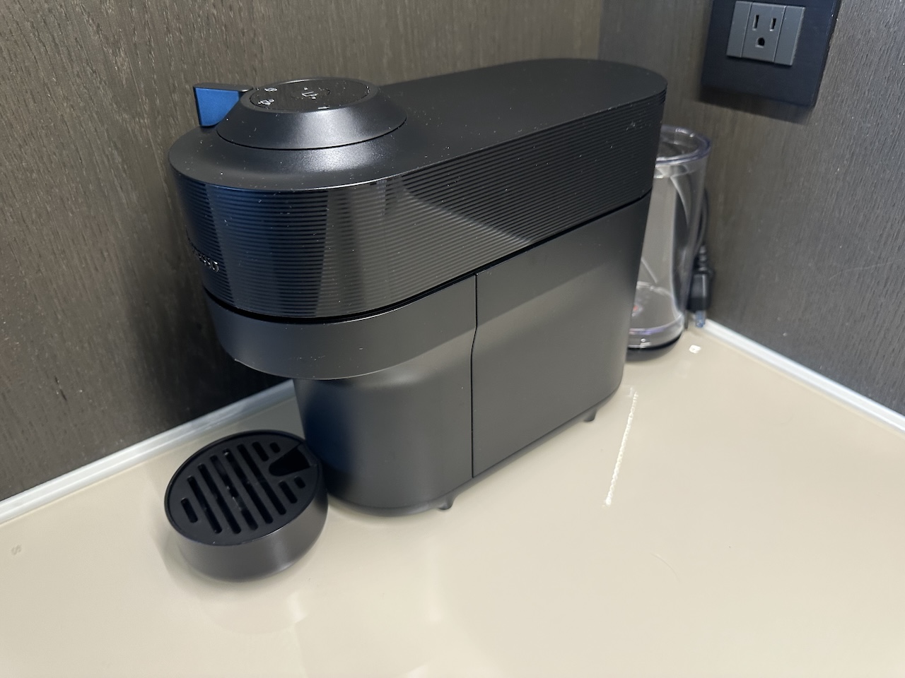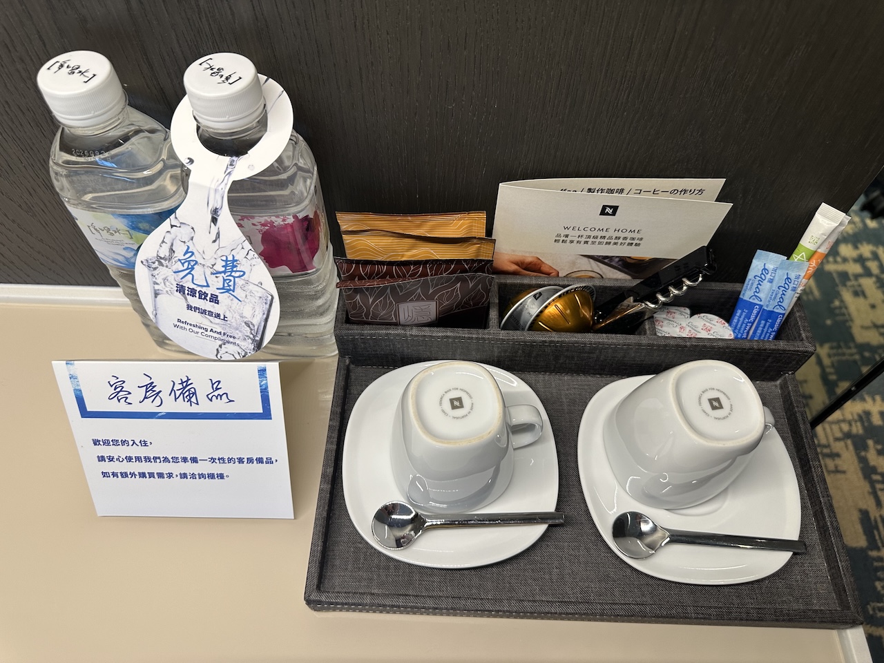 Zur Ausstattung gehören neben den üblichen Dingen wie Kühlschrank, Wasserkocher und Safe auch eine Espressomaschine. Der Inhalt der Minibar ist übrigens einmal pro Aufenthalt kostenfrei, wobei es sich hier lediglich um Softdrinks handelt.