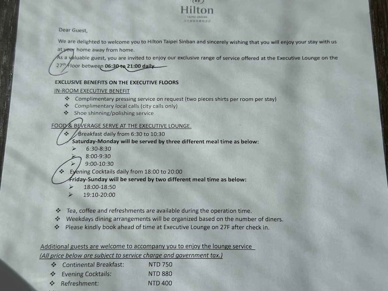 Das Hilton Taipeh ist ein gut angebundenes Stadthotel mit herausragendem Service und großen Zimmern. Die Executive Lounge ist wie so oft in einem asiatischen Hotel überdurchschnittlich gut, das Angebot ist breit und auch abwechslungsreich. Highlight sind der Außenbereich der Lounge und der Pool auf dem Dach.