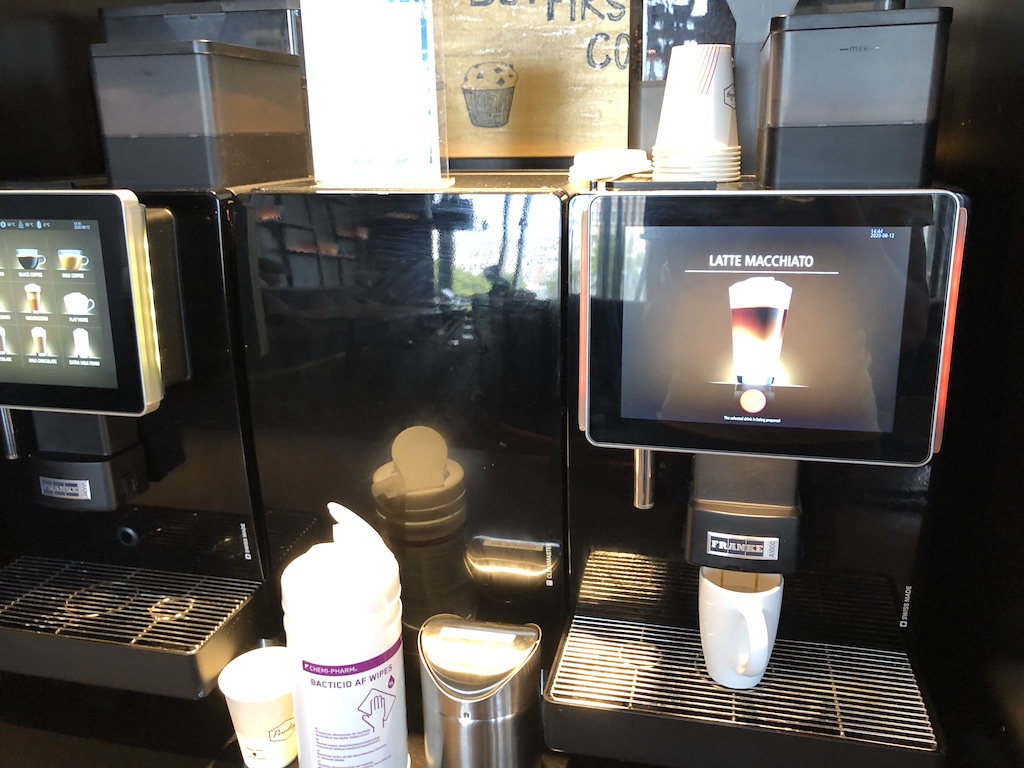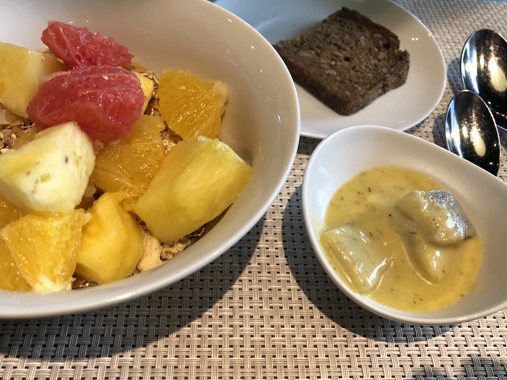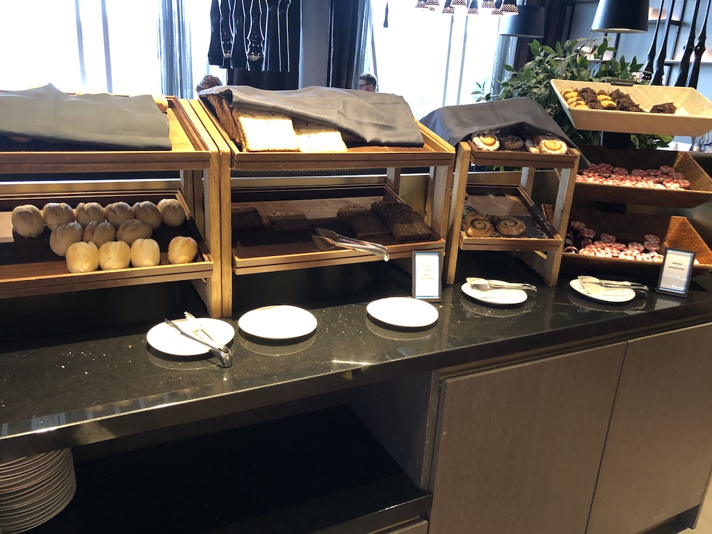 Das Frühstück wurde täglich bis 10:30 Uhr serviert, Getränke und kalte Speisen waren zur Selbstbedienung in Buffetform. Dazu gehörten Wasser und verschiedene Säfte sowie Heißgetränke aus einem Vollautomat.