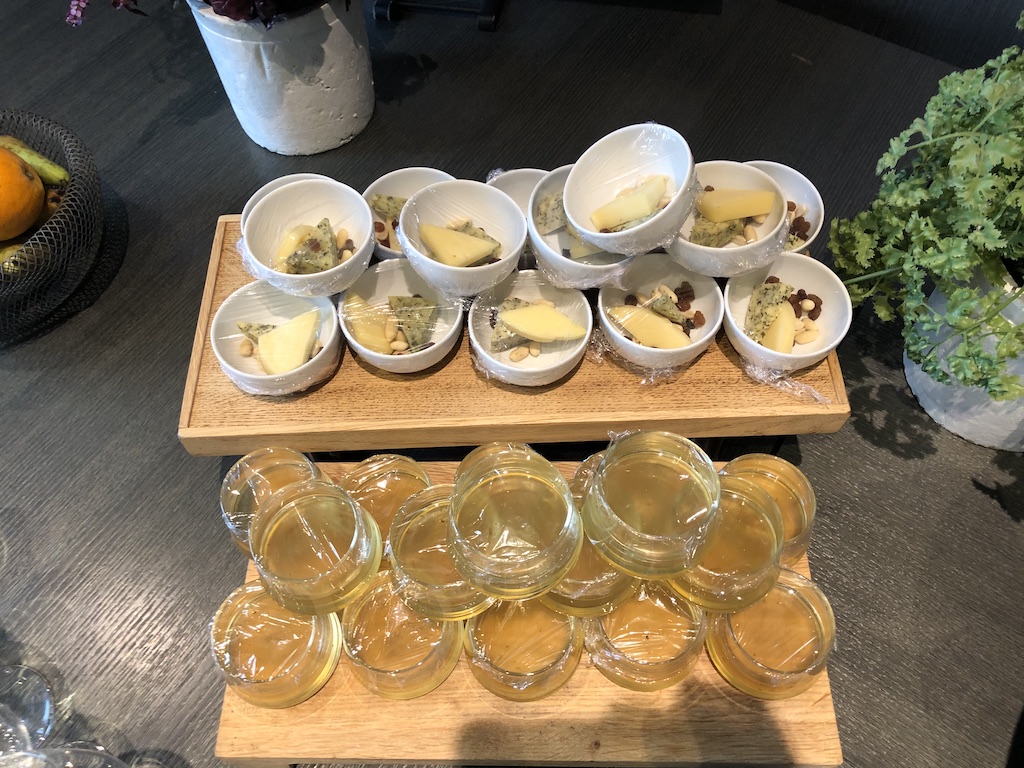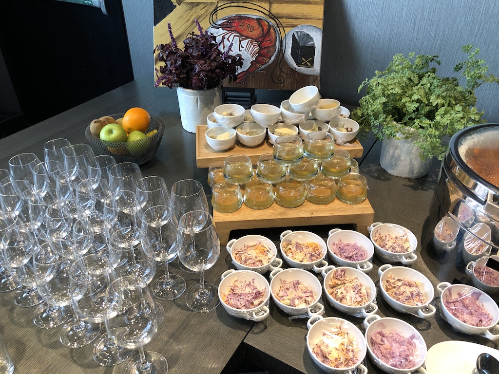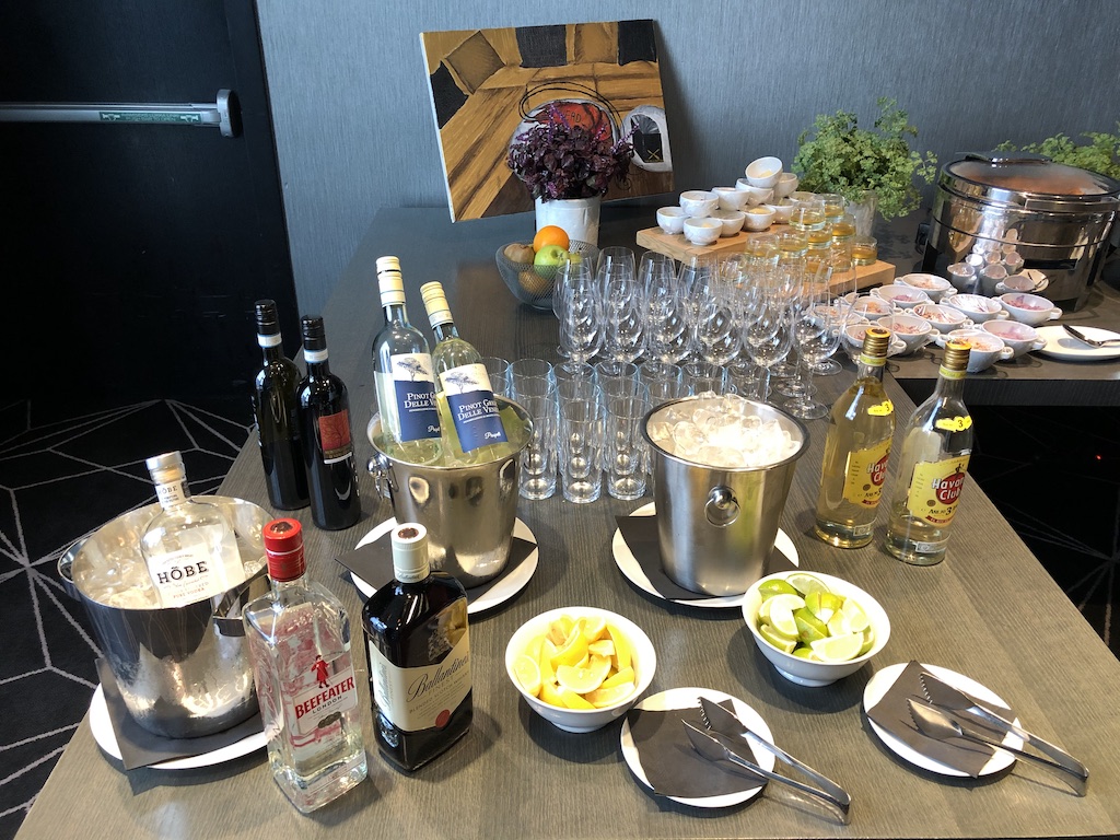 Ab 18 Uhr wurde das Buffet mit kalten und warmen Snacks sowie alkoholischen Getränken ergänzt. Das Angebot umfasste kleine Salate, Dips, Käse und warme Snacks wie Fleischbällchen oder Gemüse, die Bestandteile variierten täglich.