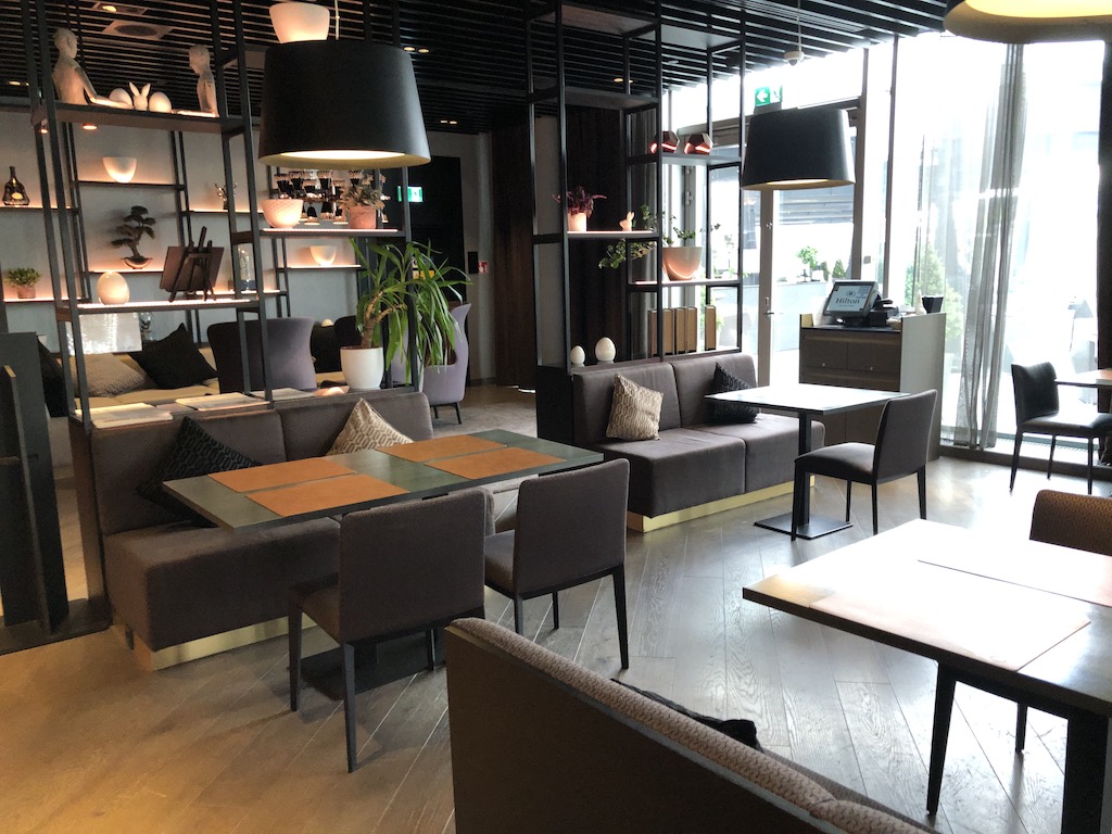 Zahlreiche unterschiedliche Sitzmöglichkeiten sind im Innenbereich, aber auch auf der angrenzenden Terrasse vorhanden. Die Tische werden mit dezenten Raumteilern und Pflanzen abgetrennt, im Hintergrund war unaufdringliche Musik zu hören.