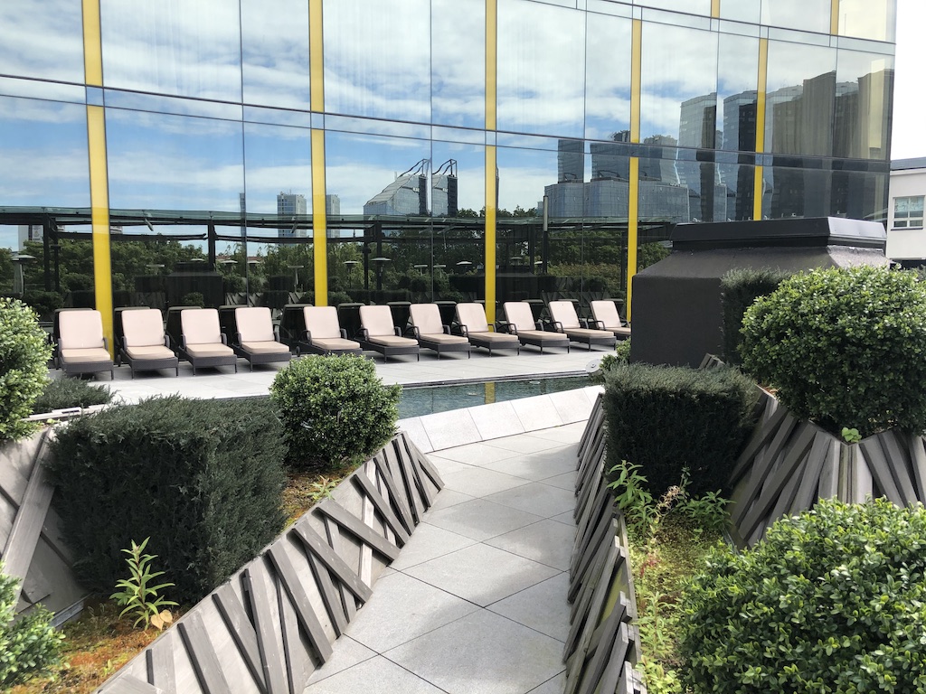 Es gab einige Liegen direkt am Pool, einen Raum für Massagen und einen separierten Ruhebereich. Auch ein Jacuzzi gehört zum Hilton Spa, daraus hat man einen guten Blick auf die Außenterasse.