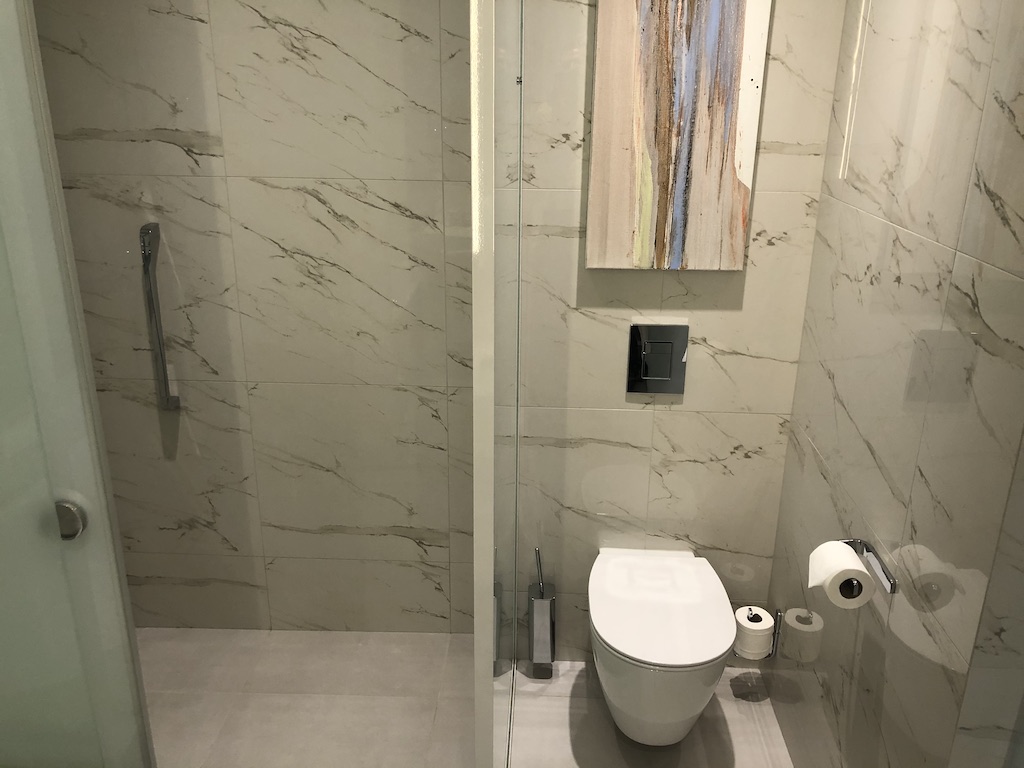 Das Schreiben mit allen Informationen zu den Covid-Maßnahmen und den Öffnungszeiten aller Einrichtungen wurde uns nochmals ausgehändigt. Das Bad war von normaler Größe, Dusche und Toilette sind abgetrennt.