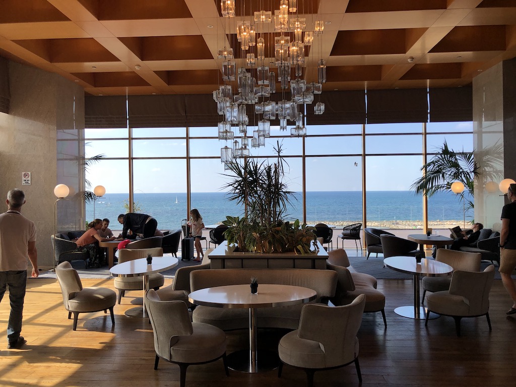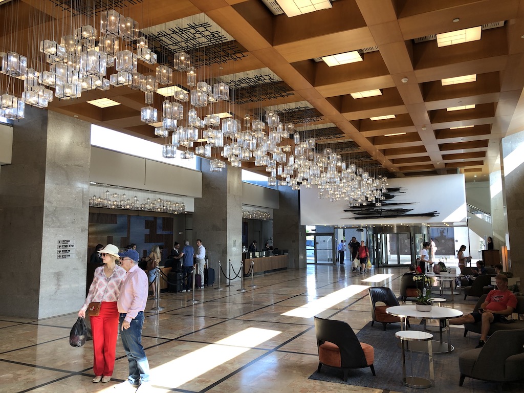 Die Lobby ist sehr hell und man hat Blick auf das Mittelmeer. Es befinden sich mehrere Mode- und Schmuckboutiquen in dem Bereich, außerdem ist ein Café mit Meerblick auf der Etage.