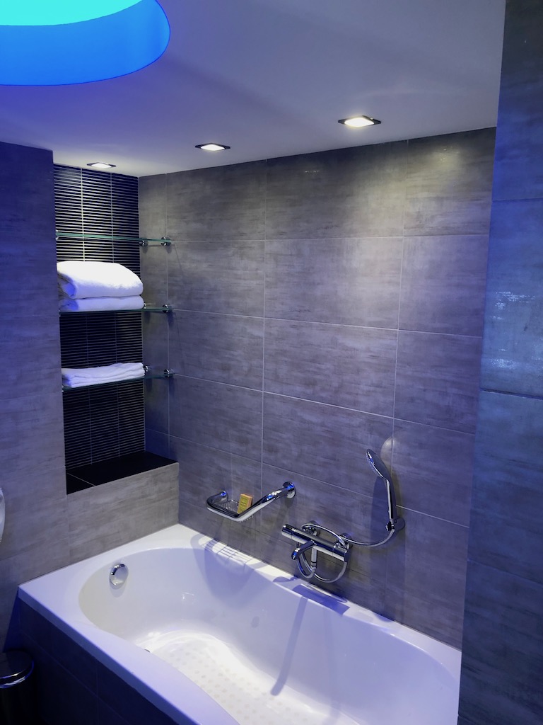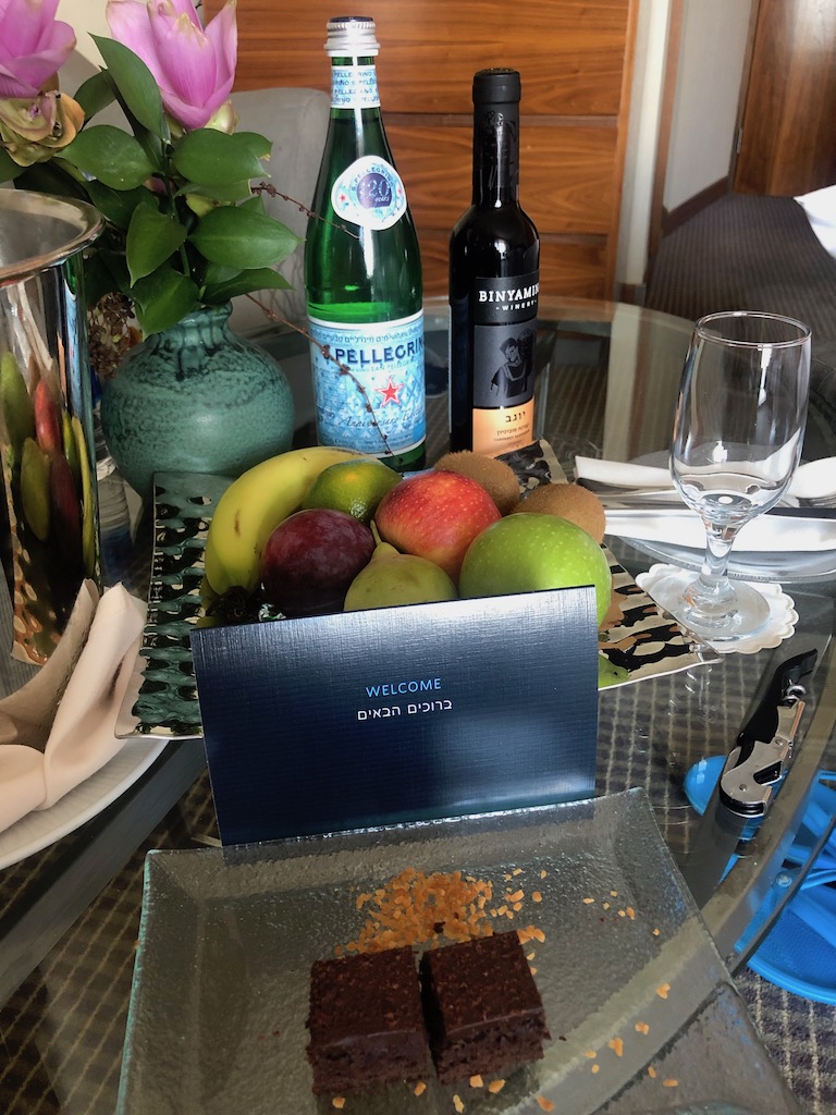 Das Badezimmer hat eine große Dusche, Blickfang ist die Beleuchtung. Eine Tasche mit Kosmetika vom Toten Meer lag neben den üblichen Pflegeprodukten bereit. Ich bin ein Fan von solchen Annehmlichkeiten, insbesondere auch als dann im Laufe des Tages noch Wein, Wasser, Obst und Pralinen ins Zimmer geliefert wurden. Eine Wertschätzung und schönes Gastgeschenk!