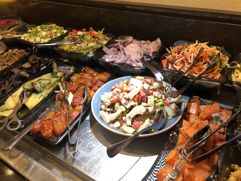 Nachmittags werden Kuchen und Gebäck in Buffetform serviert, abends werden mehrere kalte Vorspeisen und warme Gerichte angeboten. Neben diversen Antipasti gibt es zahlreiche lokale und internationale Gerichte die täglich etwas variieren. Erst um 21 Uhr wurde das Essen abgeräumt und einige Desserts auf des Buffet gestellt. Auch hier hat man einen herrlichen Ausblick und kann auf einem der drei Balkone Platz nehmen.