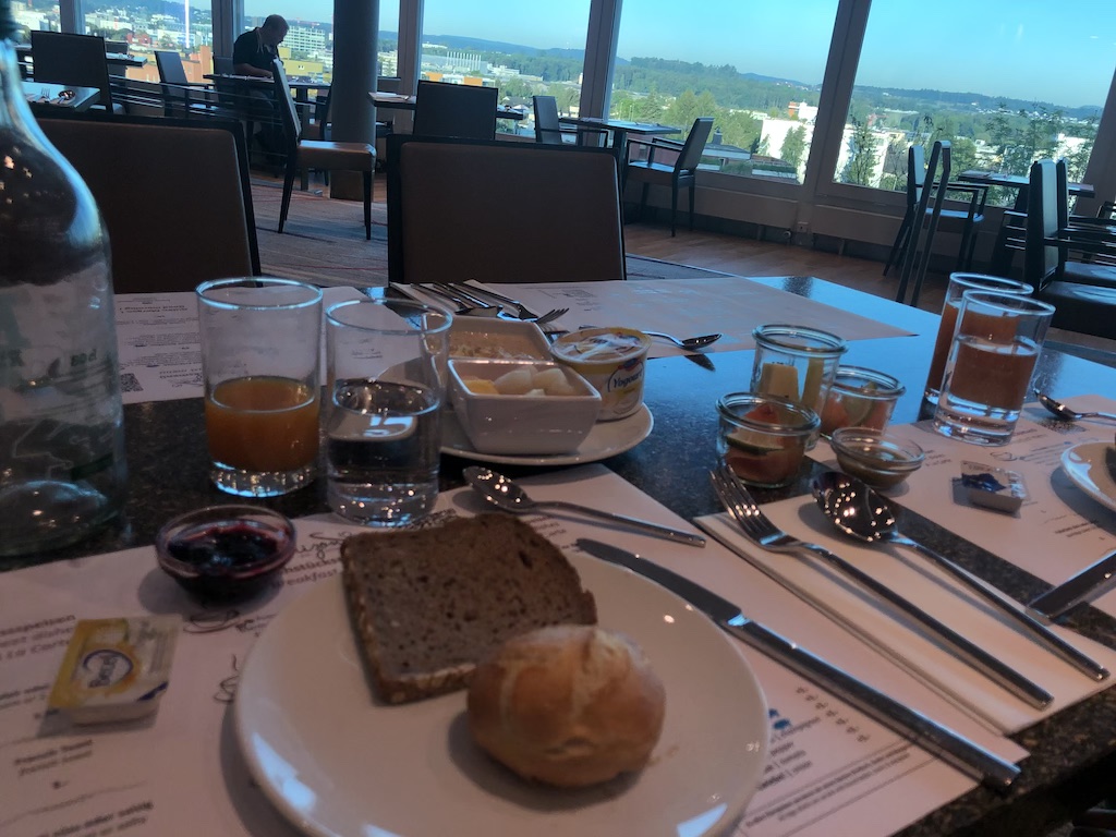 Direkt neben der Rezeption grenzt das Restaurant an, wo es auch morgens das Frühstück in Buffetform gibt. Eierspeisen kann man á la Carte bestellen, alles andere gibt es zur Selbstbedienung. Besonders gut hat mir der Ausblick aus den großen Panoramafenstern gefallen, der Raum ist tagsüber entsprechend hell.