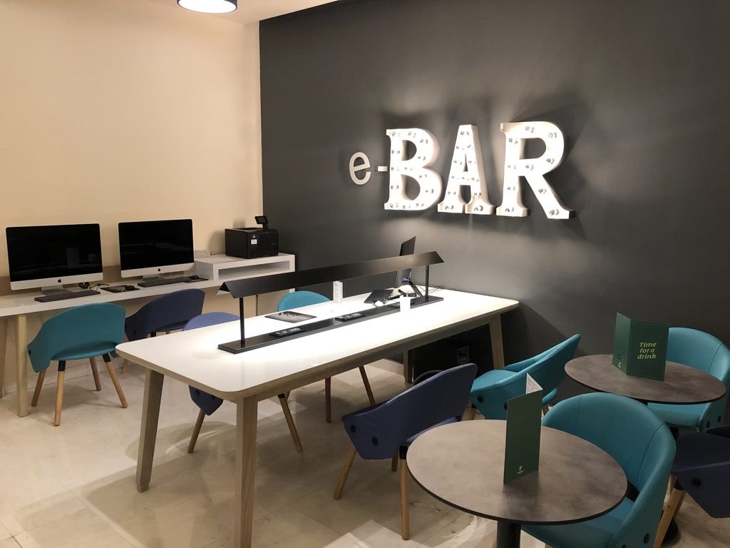 Im Lobbybereich gibt es neben zahlreichen Sitzmöglichkeiten auch einen kleinen Arbeitsbereich, als „e-BAR“ bezeichnet, in dem Computer und Drucker zum Arbeiten angeboten werden.