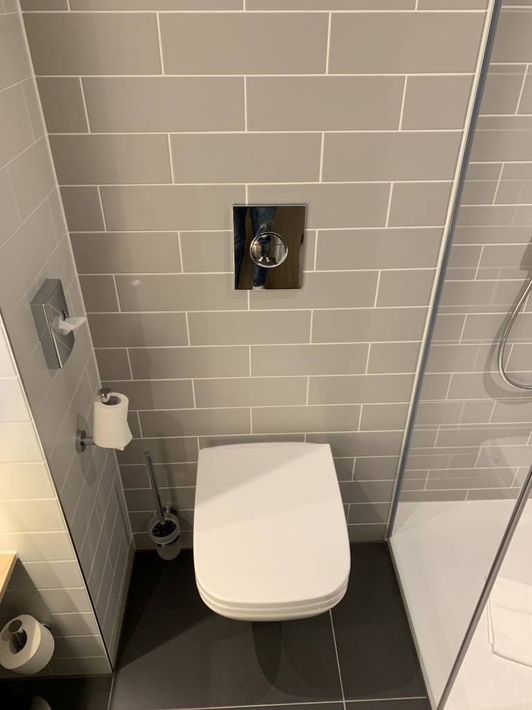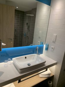 Das Badezimmer war sehr sauber und top modern. Es bestand aus Toilette, Waschtisch und einer Dusche. Den Fön fanden wir in einer Nische beim Bügelbrett im Wohnbereich. Auf Pflegeprodukte in kleinen Flaschen mussten wir wie gewohnt in Holiday Inn Express Hotels verzichten. Duschbad und Shampoo kommen aus an der Wand montierten Spendern.