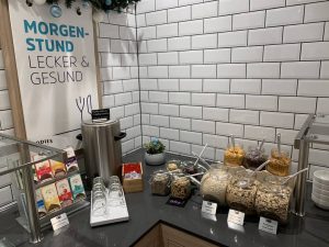 Die Umsetzung in Erlangen war top. Insbesondere die Qualität der Brötchen und die großen Croissants haben den positiven Eindruck verstärkt. Die Pancake-Maschine, die mittlerweile viele Holiday Inn Express Hotels haben, gab es auch hier.