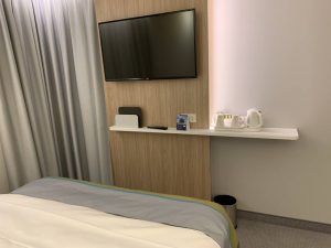 „Willkommen in Ihrem neuen Zimmer“, so bewirbt Holiday Inn Express die neue sehr funktionelle Ausstattung, die auch in Erlangen in unserem Zimmer 509 so umgesetzt wurde. Ein Zimmer überschaubarer Größe mit Queen-Bett erwarteten uns. Positiv wahrgenommen hatten wir, dass es eine große Decke statt zwei kleiner Decken gab. Das hatten wir so in einem Holiday Inn Express sonst noch nicht.