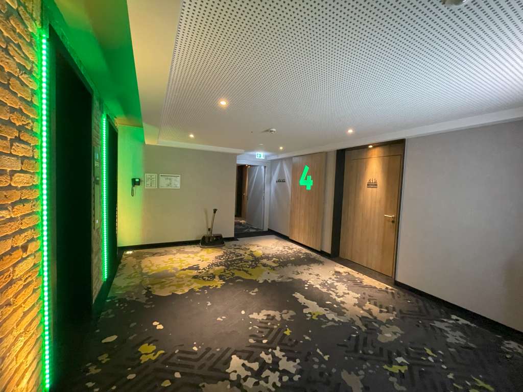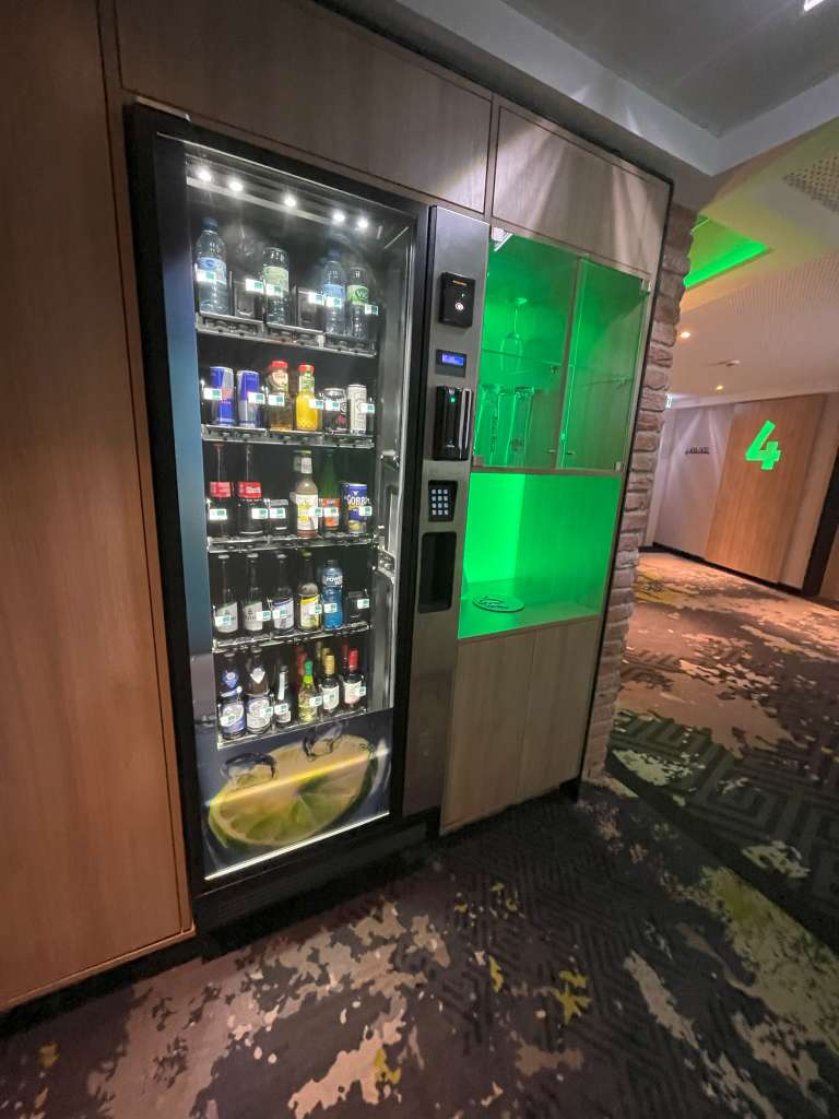 Die Junior Suiten mit Balkon des Holiday Inn Osnabrück befinden sich auf der vierten Etage. Das ist auch die oberste Etage des Hotels. Diese Zimmerkategorie ist Richtung Straße ausgerichtet, während die Premium-Zimmer auf derselben Etage Richtung Innenhof liegen. Auf der Etage wurde das moderne Design des Hotels fortgesetzt, und gegenüber meiner Zimmertür fiel mir direkt ein cooles Detail ins Auge. Dort befand sich ein Verkaufsautomat mit einem guten Sortiment an alkoholfreien und alkoholischen Getränken. Die Preise waren zwar nicht günstig (eine kleine Flasche Wein 7,00 – 7,50 Euro), aber die Option wirklich klasse. Außerdem standen in einer Vitrine nebenan die passenden Gläser. Ich verzichtete auf die Nutzung des Getränkeautomaten, da die Minibar meiner Junior Suite im Preis inkludiert war.