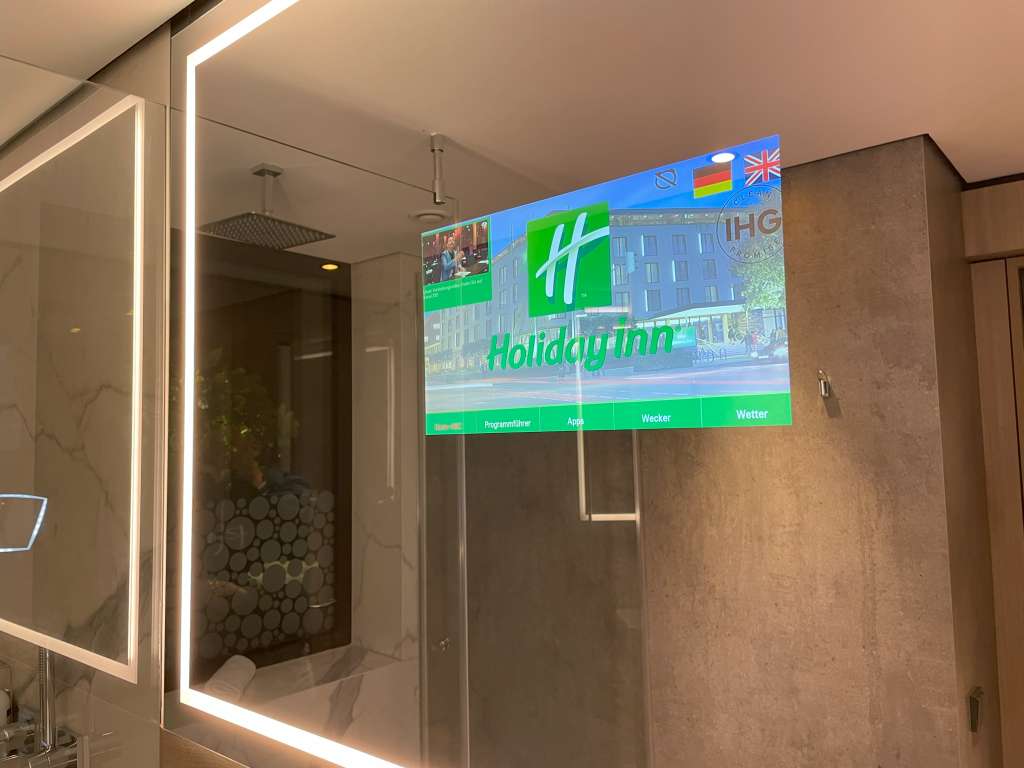 Ein kleines Gimmick bietet der Spiegel des Badezimmers. In dem ist ein Monitor integriert. Mit der Fernbedienung aus dem Wohnbereich kann dieser bedient und sowohl Fernsehprogramm als auch Musik übertragen werden.