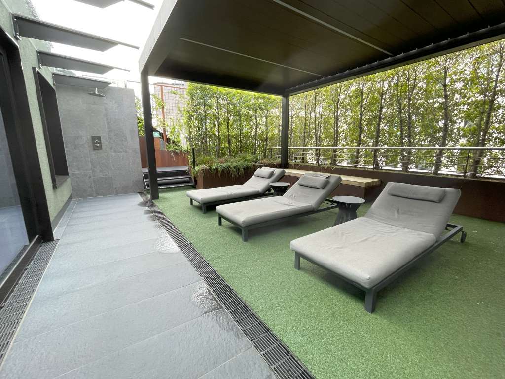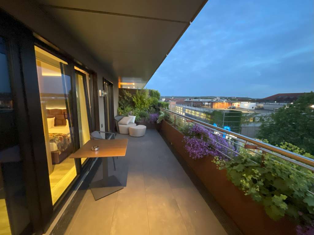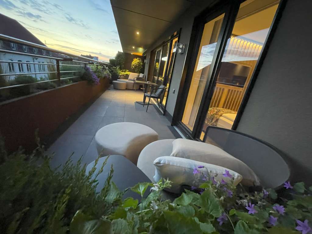 Das Highlight der Junior Suite ist jedoch der Balkon, welcher sich über die komplette Länge der Junior Suite erstreckt und durchgehend mit bodentiefen Fenstern/Glasschiebetüren vom Rest des Raumes abgetrennt ist. Beide Enden des Balkons sind bepflanzt und bieten gemütliche Lounge-Möbel in sanftem Beige. Die Bepflanzung setzt sich auch über die gesamte Balkonbrüstung fort. In der Mitte steht noch ein normaler Tisch, auf dem ein Aschenbecher steht und an dem ich mein Abendessen vom lokalen Lieferdienst genoss.