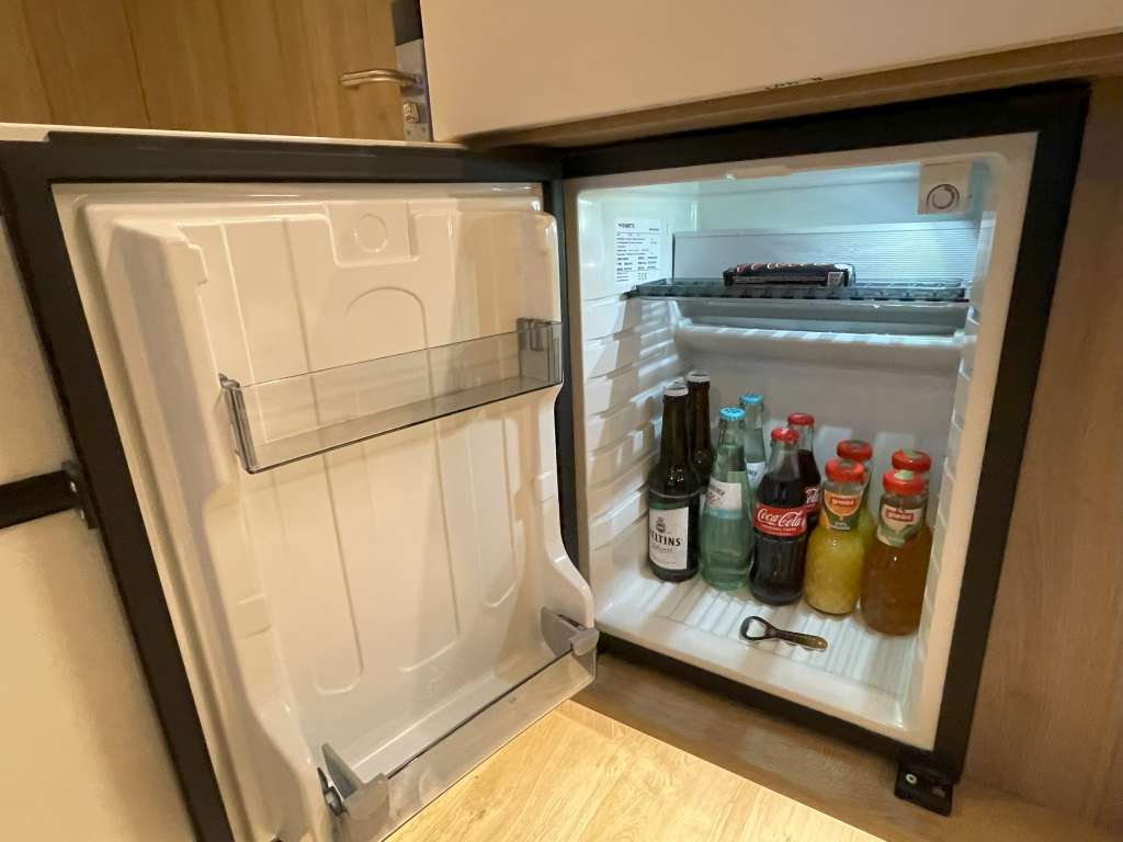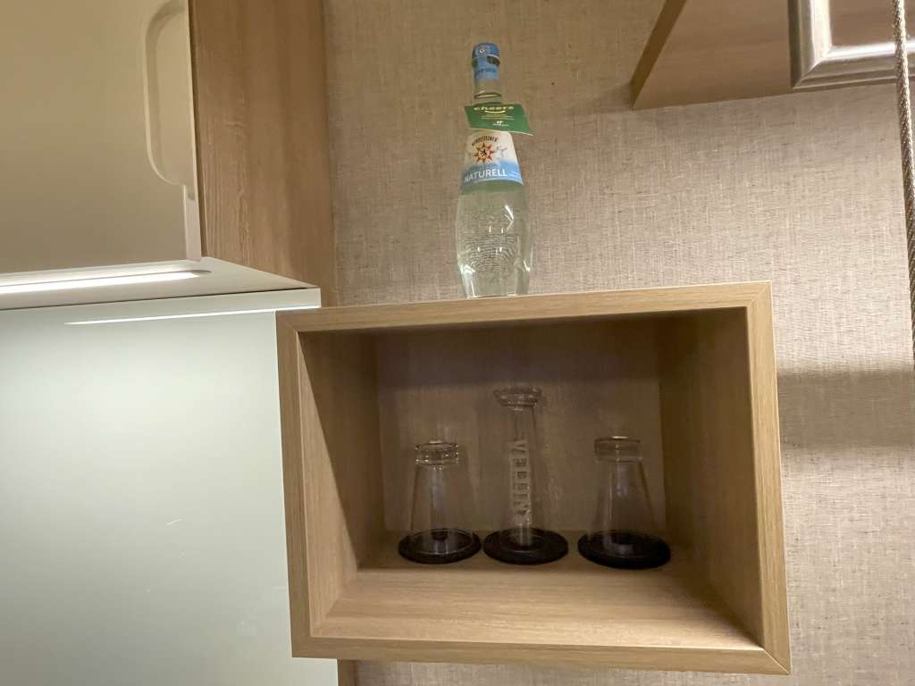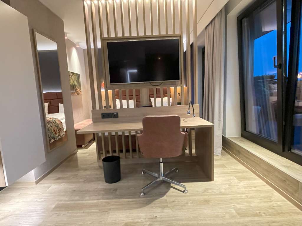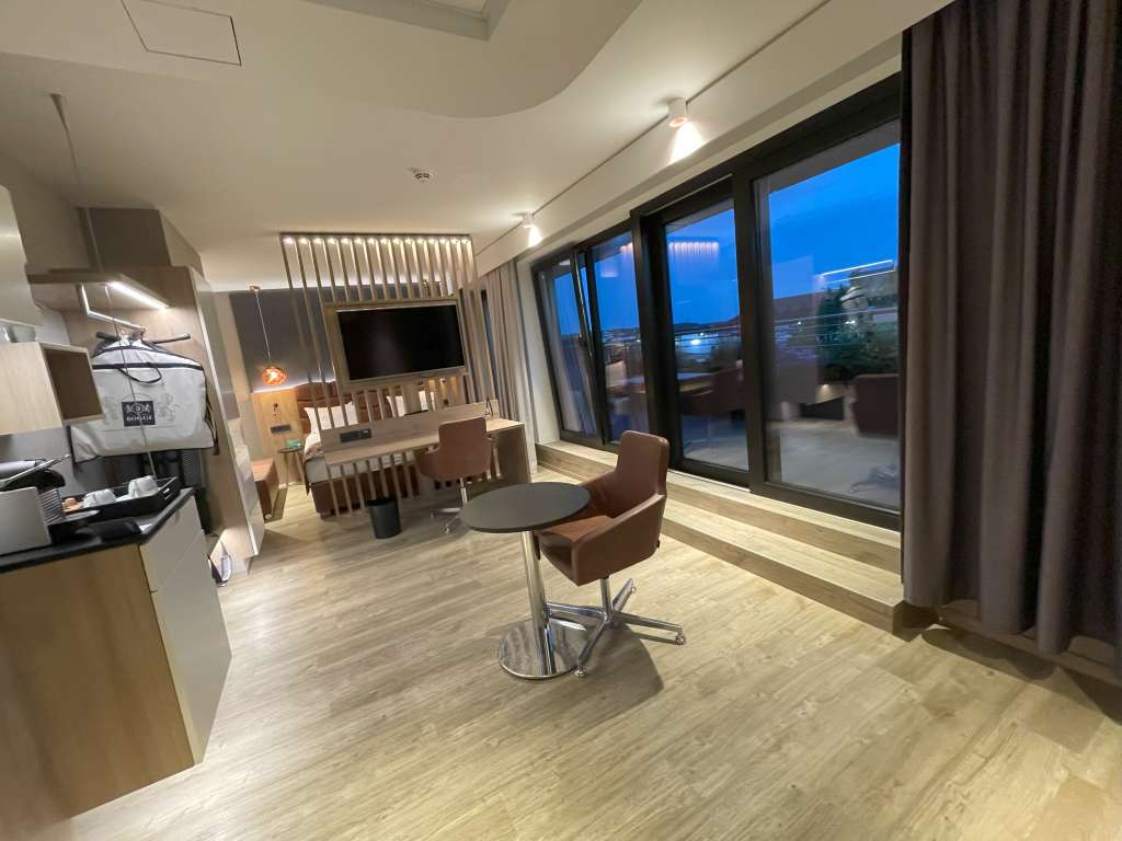 Die Junior Suiten sind eher länglich gebaut und entsprechen vermutlich dem Maß von zwei Standardzimmern. Es gibt keinen Flur, sondern man steht direkt im Wohnbereich, der durch einen Raumteiler vom Schlafbereich getrennt ist. Also eine klassische Junior Suite ohne getrennte Zimmer. Der Wohnbereich besteht aus einer kleinen Sitznische zur Rechten, einem Tisch mit Drehstuhl direkt in der Mitte des Zimmers und einem Schreibtisch mit einem weiteren Stuhl, unmittelbar an den Raumteiler angeordnet. Garderobe, Minibar und Kaffeemaschine befinden sich direkt an der Wand neben der Eingangstür zur Junior Suite. Die Minibar war mit zwei Bier, zwei Wasser und diversen Softdrinks und Säften gut gefüllt. Vom Boden bis zu den Möbeln geben helle Holztöne dem Raum ein ausreichendes Maß an Helligkeit, selbst während der Dämmerung. Akzentuiert wird die Einrichtung durch braune Ledersitzgelegenheiten und dunkelgraue Vorhänge.