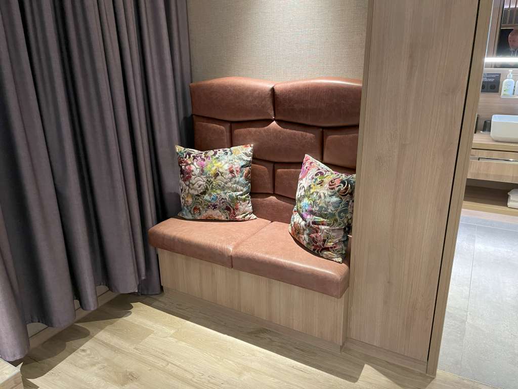 Die Lederapplikationen setzen sich auch in dem kleinen Schlafbereich hinter dem Raumteiler fort. Gegenüber des bequemen Kingsize-Bettes ist eine Sitzbank in die Wand integriert. Licht spenden zwei Hängeleuchten neben dem Bett, und Fernseher hängen am Raumteiler sowohl in Richtung Bett als auch Wohnbereich.