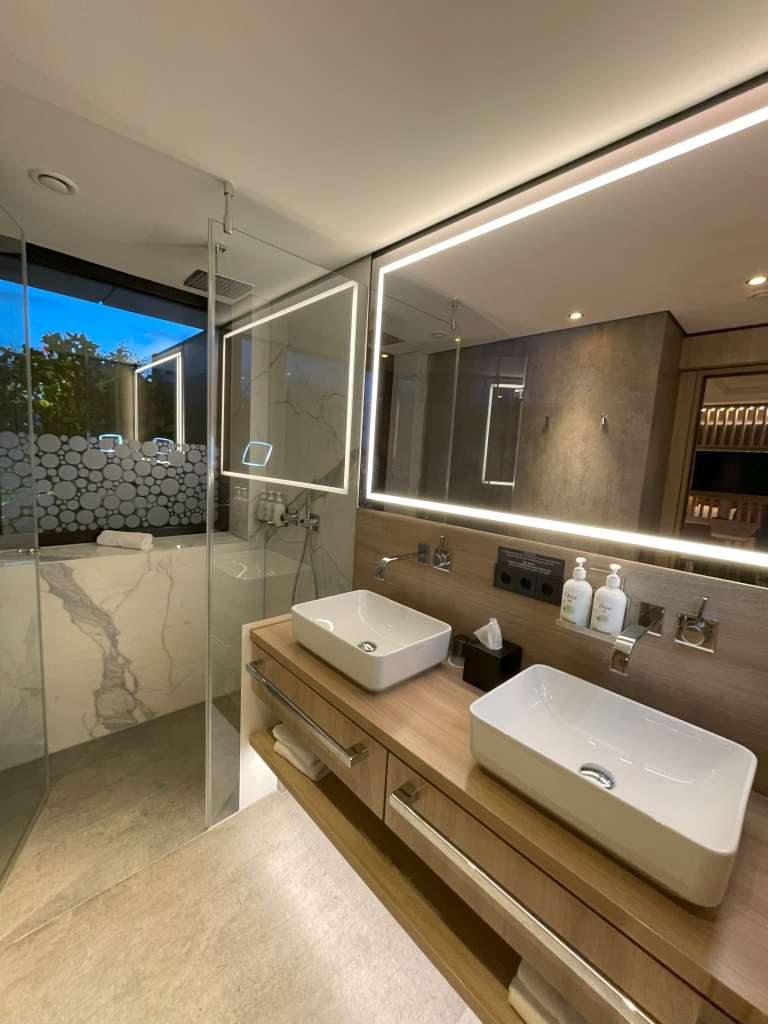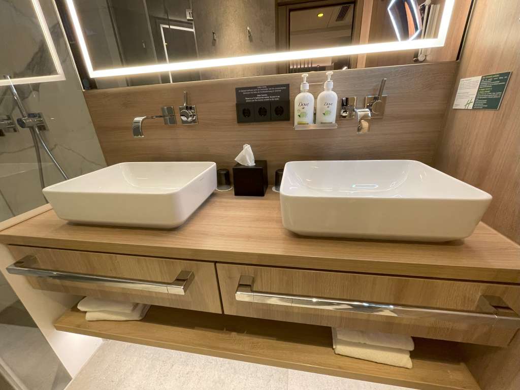 Das Bad der Junior Suite 407 befindet sich rechter Hand und ist gar nicht mal so riesig, dafür aber sehr praktisch. Die Dusche wird durch eine halblange Glaswand vom Rest des Bades abgetrennt. Ein Fenster sorgt für einen schönen Ausblick beim Duschen, ohne es an Privatsphäre mangeln zu lassen. Zwei Waschtische bieten die Möglichkeit, sich morgens parallel für den anstehenden Tag vorzubereiten. In der Schublade darunter lag ein Föhn. Die Toilette befindet sich auf der rechten Seite des Bades und lässt sich durch die eine Tür des Bades verschließen. Diese Option ist extrem praktisch, denn zum einen kann mit der Tür das Badezimmer geschlossen werden und zum anderen nur die Toilette. Was mich bei Holiday Inn Hotels abschreckt, sind die Pflegeprodukte der Marke Dove. Hier besteht wirklich Verbesserungsbedarf.