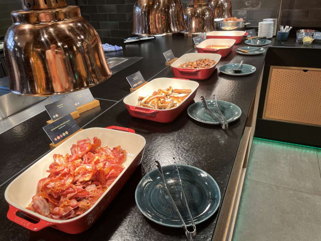 Diese Chance ergab sich erst zum Frühstück, welches ab 6:30 Uhr ebenfalls im „echt“ in Büfettform bereitgestellt wird. Dem Frühstück mangelte es an nichts. Von warmen Speisen, wie Rührei, Speck und Würstchen, bis hin zu gesunden Optionen, wie Joghurts, Obst und Salat, gab es alle Klassiker eines Hotel-Frühstücksbüfetts. Die Brötchen wirkten frisch und knackig. Mit Fleisch- und Eiersalat waren auch kleine Besonderheiten verfügbar.