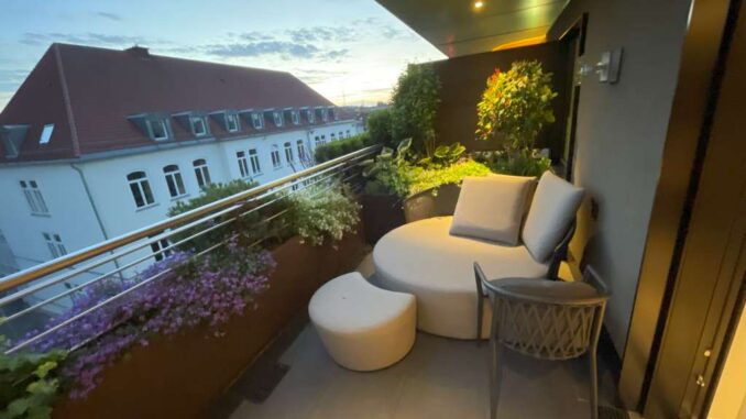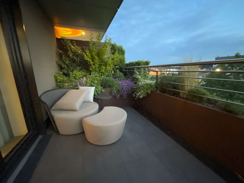 Das Highlight der Junior Suite ist jedoch der Balkon, welcher sich über die komplette Länge der Junior Suite erstreckt und durchgehend mit bodentiefen Fenstern/Glasschiebetüren vom Rest des Raumes abgetrennt ist. Beide Enden des Balkons sind bepflanzt und bieten gemütliche Lounge-Möbel in sanftem Beige. Die Bepflanzung setzt sich auch über die gesamte Balkonbrüstung fort. In der Mitte steht noch ein normaler Tisch, auf dem ein Aschenbecher steht und an dem ich mein Abendessen vom lokalen Lieferdienst genoss.