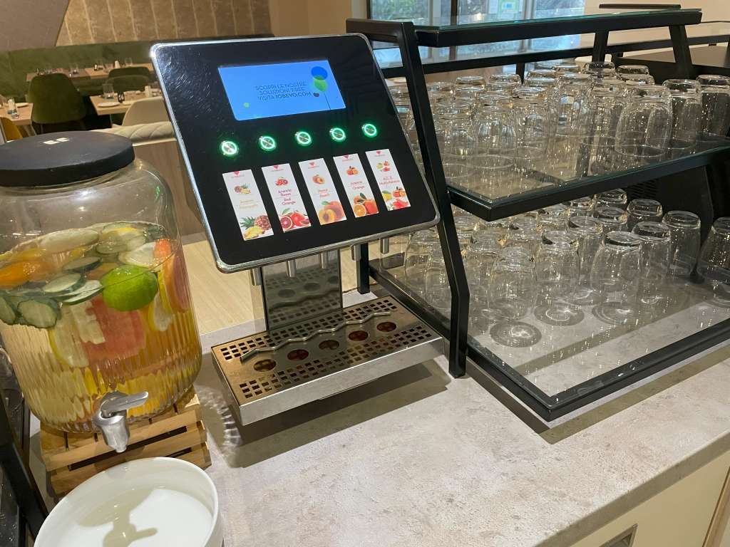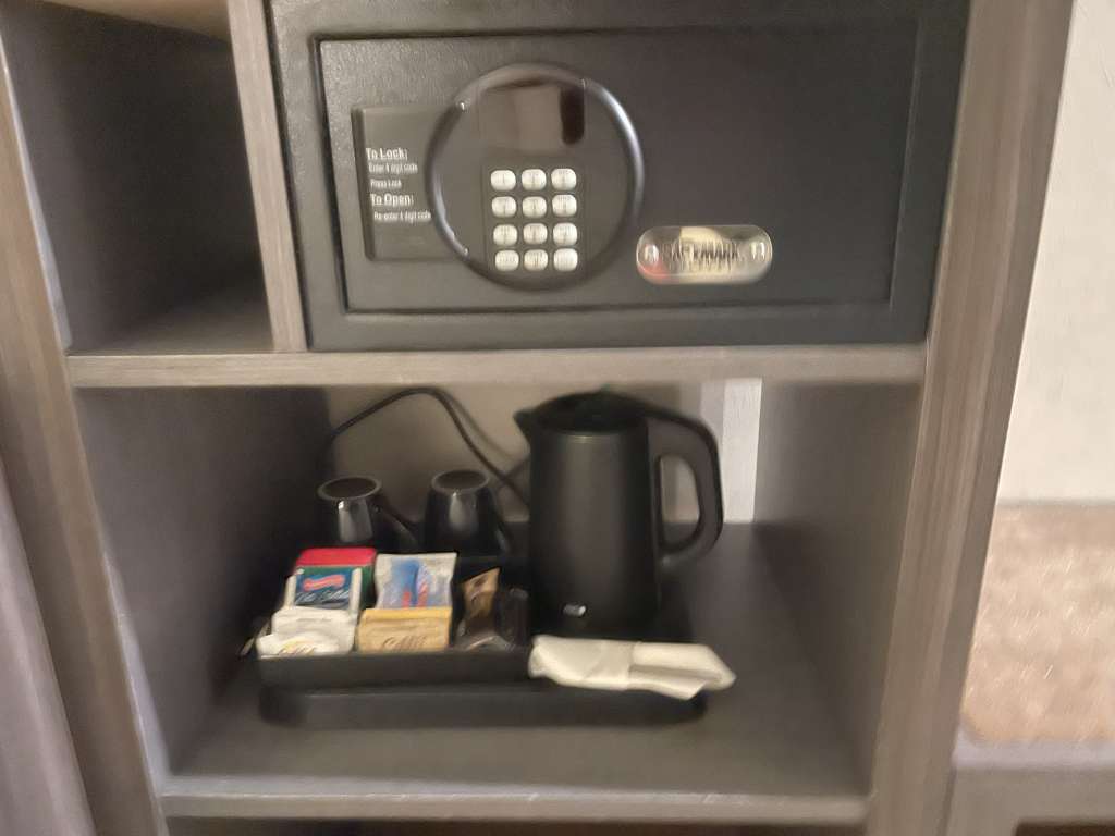 Im Zimmer gibt es einen Tresor mit Tastatureingabe, der sichere Aufbewahrung für Wertsachen wie Pässe oder Elektronik bietet. Eine Kaffee-/Teestation mit Wasserkocher, Tassen, Teebeuteln und Kaffeepulver ist ebenfalls vorhanden, was besonders nach einem langen Flug oder für morgendliche Energie ein echter Vorteil ist. Auf einem kleinen Tisch fand ich zudem zwei kostenlose Dosen stilles und sprudelndes Wasser mit einer Hinweis-Karte „For You On Us“ – eine nette Geste des Hotels, die den Aufenthalt angenehmer macht.