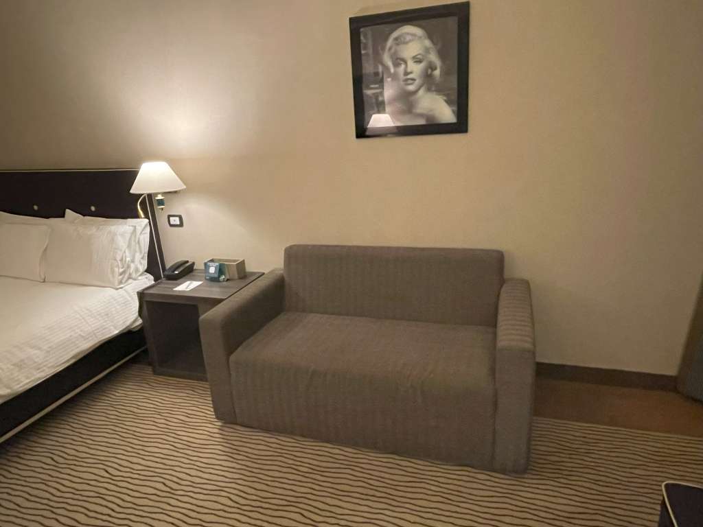 Das Zimmer verfügt über ein Doppelbett mit einer schwarzen Polsterkopfteil und weißer Bettwäsche, die Sauberkeit und Komfort vermittelt. Neben dem Bett steht ein Nachttisch mit einer Lampe, die für gedämpftes Licht sorgt. Ein kleines Sofabett war ebenfalls vorhanden, perfekt für kurze Pausen oder als zusätzlicher Platz für weitere Gäste, wie die eigenen Kinder. Die Dekoration ist dezent, mit Wandbildern (z. B. ein Schwarz-Weiß-Porträt von Marilyn Monroe), die eine leichte kulturelle Note einbringen, ohne den Raum zu überladen.