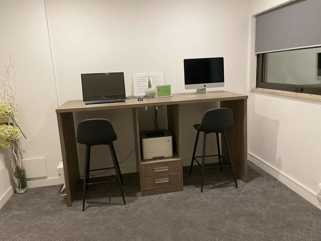 Das Zimmer wirkte sauber, hell und einladend, mit einer Kombination aus neutralen Farben wie Beige, Braun und Grau. Der Boden ist mit einem stilvollen Teppich in gedeckten Tönen ausgelegt, der dem Raum eine ruhige und professionelle Atmosphäre verleiht. Die Möbel sind zeitgemäß und funktional, mit dunklem Holz oder modernen Materialien, die gut zur Gesamtausstattung passen.