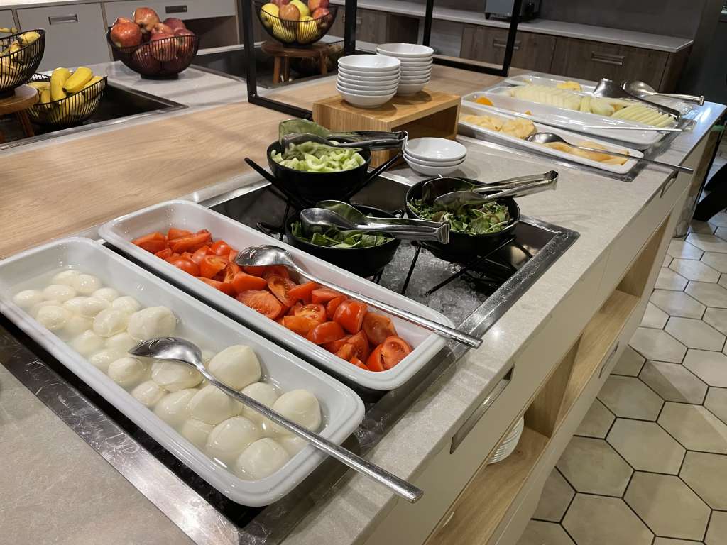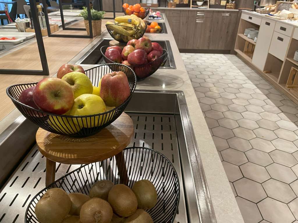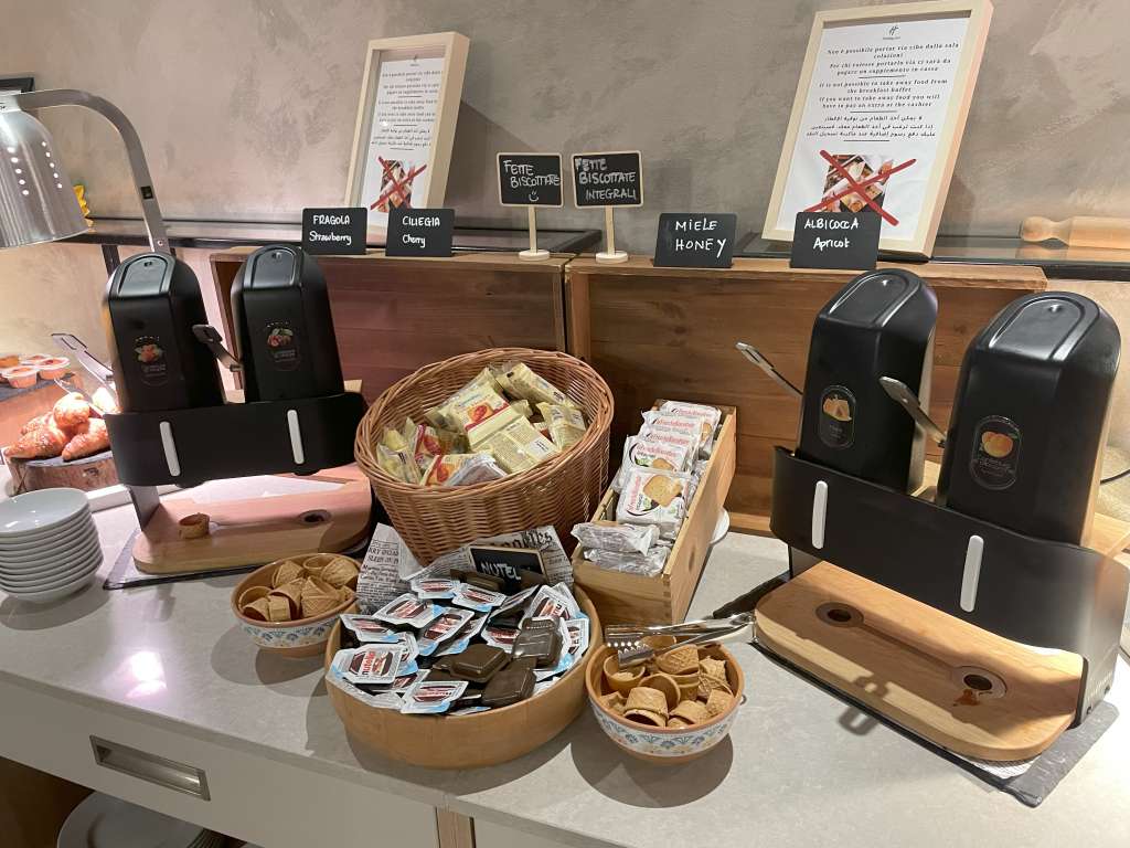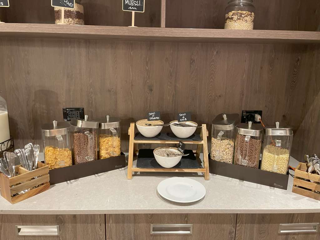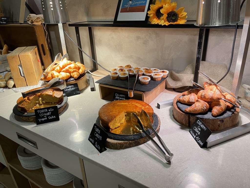 Das Frühstücksangebot des Holiday Inn Hotel Rome – Eur Parco Dei Medici bietet ein abwechslungsreiches und ansprechendes Buffet, das sowohl lokale italienische als auch internationale Vorlieben bedient. Es gibt eine reiche Auswahl an frischen Backwaren wie Croissants, Baguettes und Brötchen, ergänzt durch süße Spezialitäten wie Schokoladen-, Karotten-, Joghurt- und Pistazienkuchen sowie Muffins. Warme Gerichte wie Rühreier, Speck und Würstchen, frisches Obst (Äpfel, Bananen, Orangen, Kiwis), Joghurt, Müslis, Käse- und Wurstwaren (z. B. Schinken, Salami, Blauschimmelkäse) sowie Gemüse wie Tomaten, Mozzarella und Salat runden das Angebot ab. Marmeladen, Honig, Butter und eine moderne Getränkestation mit Säften und Infused Water sorgen für weitere Vielfalt.